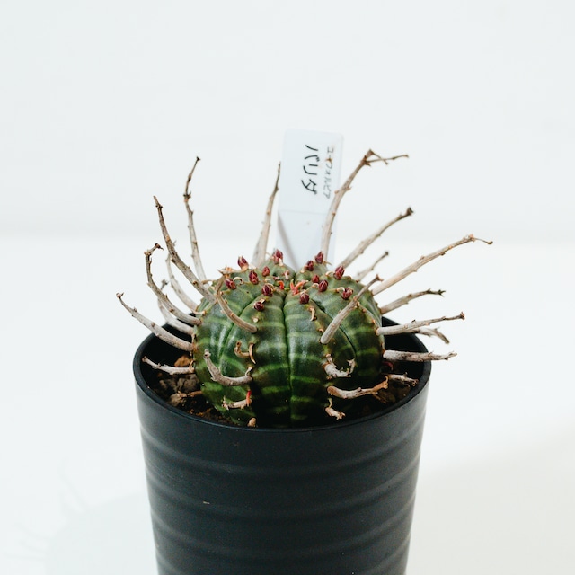商品名 ユーフォルビア・バリダ(Euphorbia valida) 250215_C ● 特徴 ユーフォルビア・バリダは、南アフリカ原産の球状ユーフォルビアで、オベサと並び絶大な人気を誇る品種です。最大の特徴は、花が咲いた後の「花柄(かきょう)」が枯れてトゲのように残り、幾何学的な球体に野生味あふれる表情を添える点にあります。 成長とともにこの花殻が重なり合い、王冠のような力強いシルエットへと進化します。葉を持たないミニマルな姿ながら、表面に現れる鮮明な縞模様(ゼブラ柄)は非常に美しく、まさに「機能美」を体現したような植物です。成長はゆっくりですが、その分、時間をかけて自分だけの一株に育てる喜びを味わえます。 最後の写真はサイズ比較用に330ml缶(直径約66mm、高さ約115mm)と一緒に撮影しております。サイズのご参考にしてください。 ● 原産地 南アフリカ(東ケープ州) 国内実生株 ● 育て方のポイント ・日光:一年を通して日当たりの良い場所を好みます。日光が不足すると縦に伸びて形が崩れやすいため、しっかりと光に当てて引き締まった株に育ててください。 ・水やり:乾燥に非常に強い性質です。土が完全に乾いてから数日後にたっぷりと与えます。冬場は休眠に入るため、月1回程度の霧吹きや断水気味に管理し、耐寒性を高めます。 ・温度:5℃以上を保つのが理想的です。寒さには比較的強いですが、冬場は室内の明るい場所で管理してください。 ・土:水はけの良さを重視した、多肉植物・サボテン専用の配合土を使用してください。 ● ご注意 ・ユーフォルビア属の特性として、傷つくと白い乳液(樹液)が出ます。体質によりかぶれる恐れがあるため、植え替え時などは直接触れないようご注意ください。 ・花殻(トゲ状の部分)の残り方や縞模様の出方には個体差があります。 ・リサイクル段ボールでのお届けとなる場合があります。 #ユーフォルビア #バリダ #Euphorbia #valida #多肉植物 #観葉植物 #サボテン #塊根植物 #ビザールプランツ #インテリアグリーン #ゼブラ柄