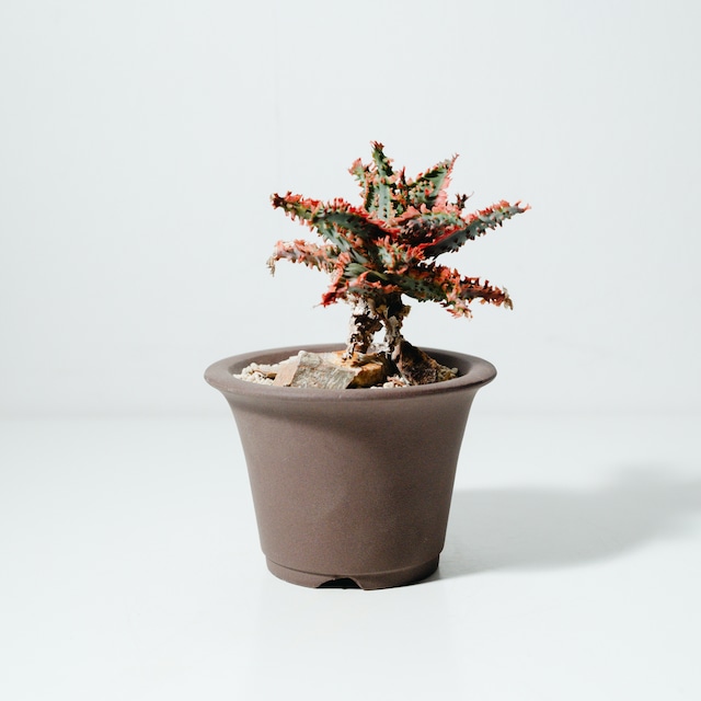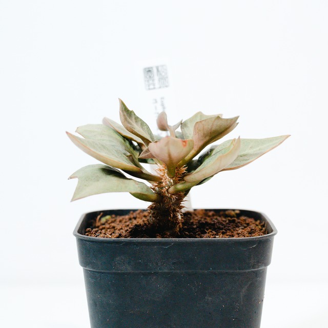 商品名 ユーフォルビア・フランコイシー(Euphorbia francoisii) 260215A ● 特徴 ユーフォルビア・フランコイシーは、マダガスカル原産の塊根性ユーフォルビアです。最大の特徴は、個体ごとに千差万別な表情を見せる「葉」の美しさにあります。波打つような縁取りや、多色使いの絵画のような斑模様は、まさに自然の芸術品です。 成長とともに根元が太く肥大し、多肉植物としての力強さと、繊細な葉の造形を同時に楽しめます。タイなどで品種改良が盛んに行われており、本個体も独特の渋い色味とウェーブが際立つ良株です。 最後の写真はサイズ比較用に330ml缶(直径約66mm、高さ約115mm)と一緒に撮影しております。サイズのご参考にしてください。 ● 原産地 マダガスカル南部(トゥリアラ近郊) ● 育て方のポイント ・日光:一年を通して日当たりの良い場所を好みます。日光がしっかり当たると、葉の色が鮮やかになり、締まった株に育ちます。真夏の直射日光で葉焼けする場合は、軽く遮光してください。 ・水やり:成長期の春から秋は、土が乾いたらたっぷりと与えます。冬場は休眠に入るため、水やりを控えめにし、月に1〜2回土を湿らせる程度で管理します。 ・温度:寒さにはやや弱いため、冬場は室内で管理し、10℃〜15℃以上を保つのが理想的です。 ・土:水はけの良い多肉植物・サボテン用の配合土が適しています。 ● ご注意 ・フランコイシーは葉の個体差が非常に激しい植物です。環境や季節によっても葉の色味が変化することがあります。 ・配送中に古い葉が落ちることがありますが、成長点が生きていれば次々と新しい葉が出てきます。 ・リサイクル段ボールでのお届けとなる場合があります。