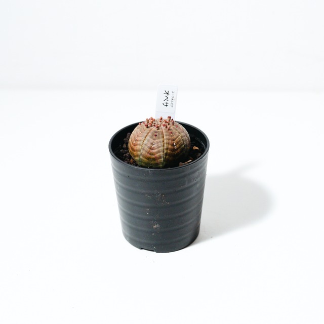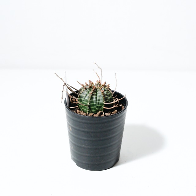 商品名 ユーフォルビア・バリダ(Euphorbia valida) ● 特徴 ユーフォルビア・バリダは、南アフリカ原産の球状ユーフォルビアで、オベサと並び絶大な人気を誇る品種です。最大の特徴は、花が咲いた後の「花柄(かきょう)」が枯れてトゲのように残り、幾何学的な球体に野生味あふれる表情を添える点にあります。 成長とともにこの花殻が重なり合い、王冠のような力強いシルエットへと進化します。葉を持たないミニマルな姿ながら、表面に現れる鮮明な縞模様(ゼブラ柄)は非常に美しく、まさに「機能美」を体現したような植物です。成長はゆっくりですが、その分、時間をかけて自分だけの一株に育てる喜びを味わえます。 最後の写真はサイズ比較用に330ml缶(直径約66mm、高さ約115mm)と一緒に撮影しております。サイズのご参考にしてください。 ● 原産地 南アフリカ(東ケープ州) 国内実生株 ● 育て方のポイント ・日光:一年を通して日当たりの良い場所を好みます。日光が不足すると縦に伸びて形が崩れやすいため、しっかりと光に当てて引き締まった株に育ててください。 ・水やり:乾燥に非常に強い性質です。土が完全に乾いてから数日後にたっぷりと与えます。冬場は休眠に入るため、月1回程度の霧吹きや断水気味に管理し、耐寒性を高めます。 ・温度:5℃以上を保つのが理想的です。寒さには比較的強いですが、冬場は室内の明るい場所で管理してください。 ・土:水はけの良さを重視した、多肉植物・サボテン専用の配合土を使用してください。 ● ご注意 ・ユーフォルビア属の特性として、傷つくと白い乳液(樹液)が出ます。体質によりかぶれる恐れがあるため、植え替え時などは直接触れないようご注意ください。 ・花殻(トゲ状の部分)の残り方や縞模様の出方には個体差があります。 ・リサイクル段ボールでのお届けとなる場合があります。 #ユーフォルビア #バリダ #Euphorbia #valida #多肉植物 #観葉植物 #サボテン #塊根植物 #ビザールプランツ #インテリアグリーン #ゼブラ柄