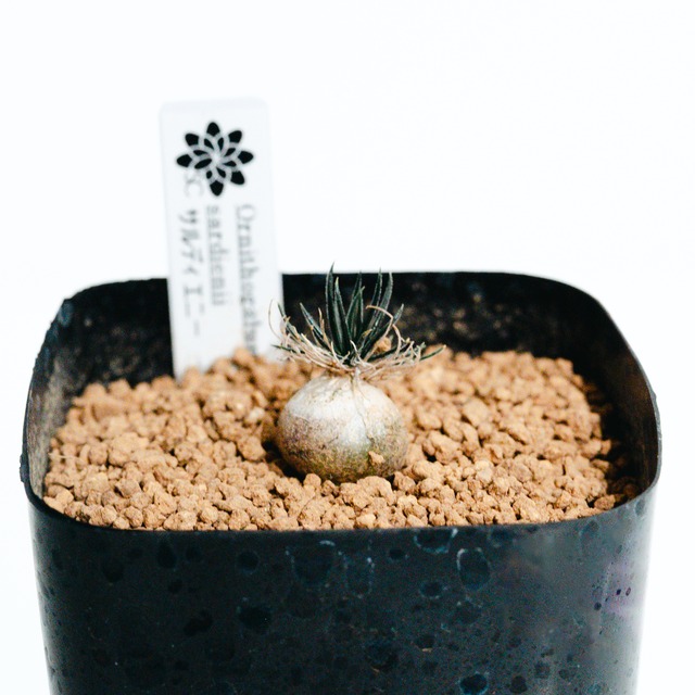 商品名 オーニソガラム・サルディエニー(Ornithogalum sardienii) ● 特徴 オーニソガラム・サルディエニーは、南アフリカ原産のケープバルブ(球根植物)の一種です。最大の特徴は、成長とともに分球し、群生していく小さな「玉ねぎ状」の鱗茎(球根)です。その球根から、針のように細く繊細な銀緑色の葉を密に茂らせる姿は、まるでミニチュアの盆栽のような趣があります。 春から夏にかけて、細い花茎の先に白い可憐な小花を咲かせます。場所を取らず、デスクの上や棚など省スペースでも楽しめるため、塊根植物(コーデックス)ファンや多肉植物愛好家にも非常に人気が高い品種です。 最後の写真はサイズ比較用にプレステラ90と一緒に撮影しております。サイズのご参考にしてください。 ● 原産地 南アフリカ(東ケープ州) ● 育て方のポイント ・日光:一年を通して日当たりと風通しの良い場所を好みます。日光が不足すると葉が徒長しやすいため、室内では明るい窓際で管理してください。 ・水やり:乾燥に強く、土がしっかり乾いてからたっぷりと与えます。夏場は休眠期に入るため、水やりを控えめにして風通しを確保してください。 ・温度:寒さには比較的強いですが、霜に当たると傷むため、冬場は5℃〜10℃以上の室内で管理するのが安全です。 ・土:水はけの良さを重視した、多肉植物用やサボテン用の配合土が適しています。 ● ご注意 ・植物ですので、お届けまでに葉の枯れや状態の変化が起こる可能性があります。 ・球根の形や葉の密度には個体差があります。生き物であることをご理解の上、ご購入ください。 ・リサイクル段ボールでのお届けとなる場合があります。