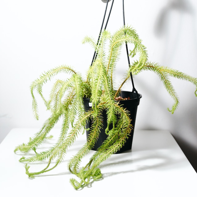 フレグマリウス・スクアローサは、シダ植物の仲間に分類される着生植物です。なかでも「ニューギニア」の名を冠する本種は、針葉樹を思わせる細く尖った葉が、まるでブラシのように密集して茎を覆う姿が非常に美しい品種です。