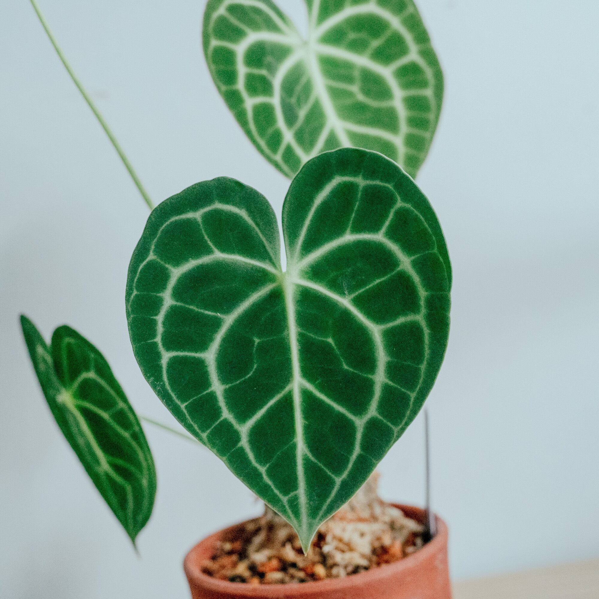 アンスリウム・クラリネルビウム(Anthurium clarinervium)は、メキシコ原産のアンスリウムで、ベルベットのように柔らかい質感のハート型の葉と、くっきりと浮かび上がる白い葉脈が特徴の美種です。1枚1枚がアートのような存在感を持ち、インテリアグリーンとしても人気が高い逸品。高湿度を好みますが、育て方を押さえれば初心者でも楽しめます。