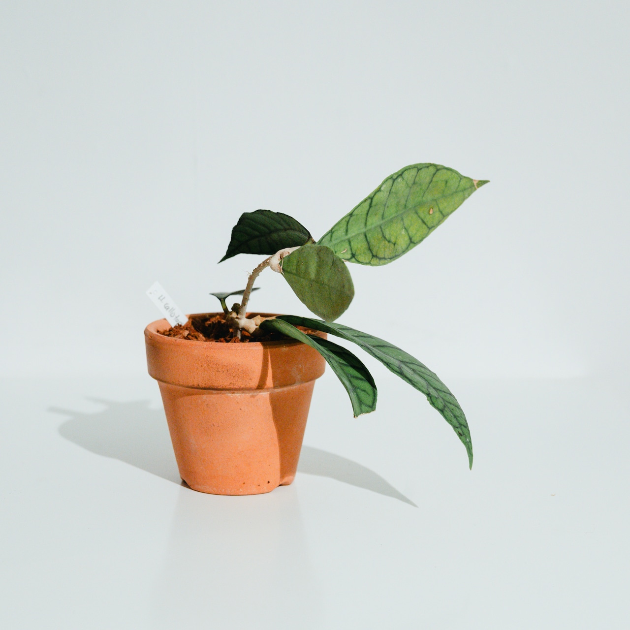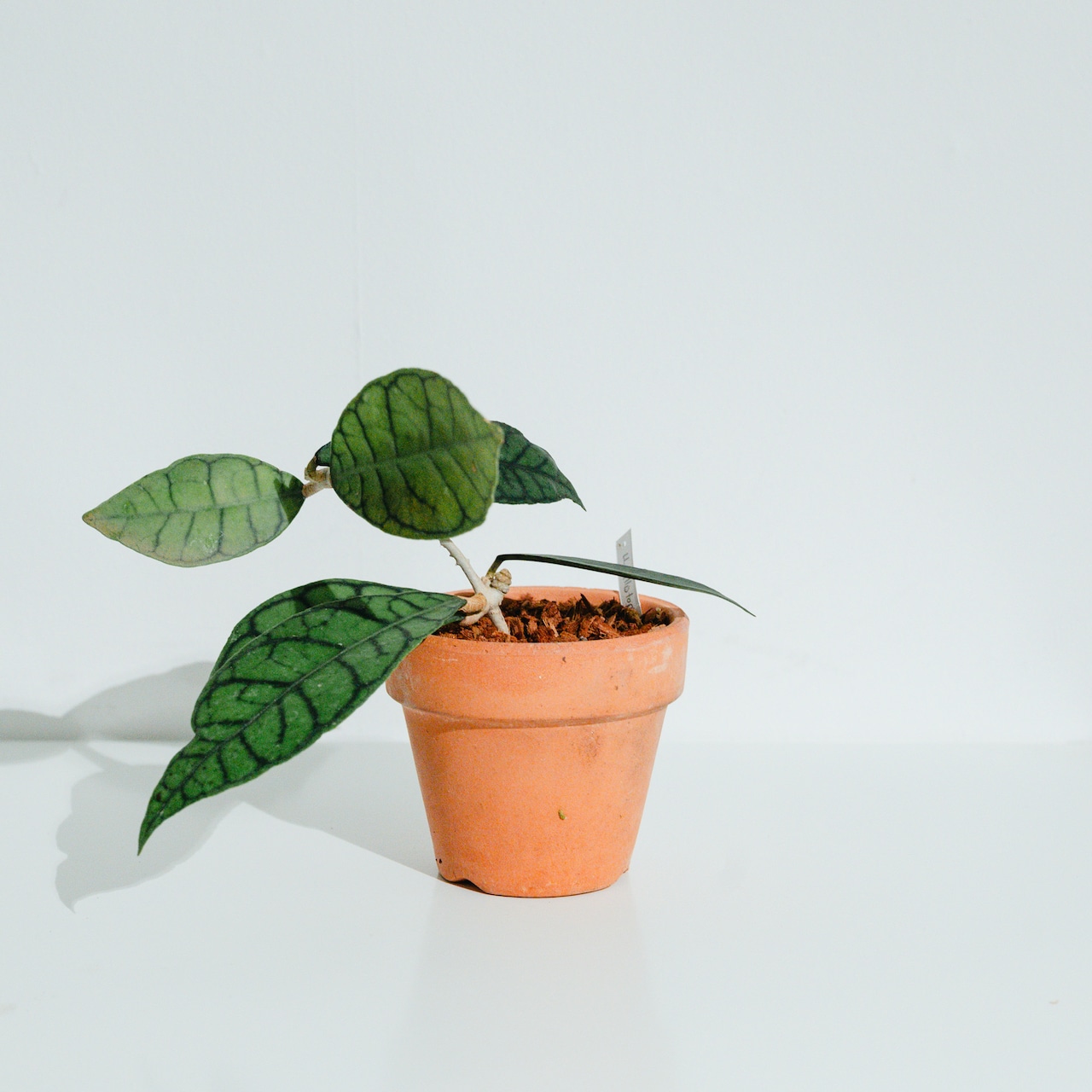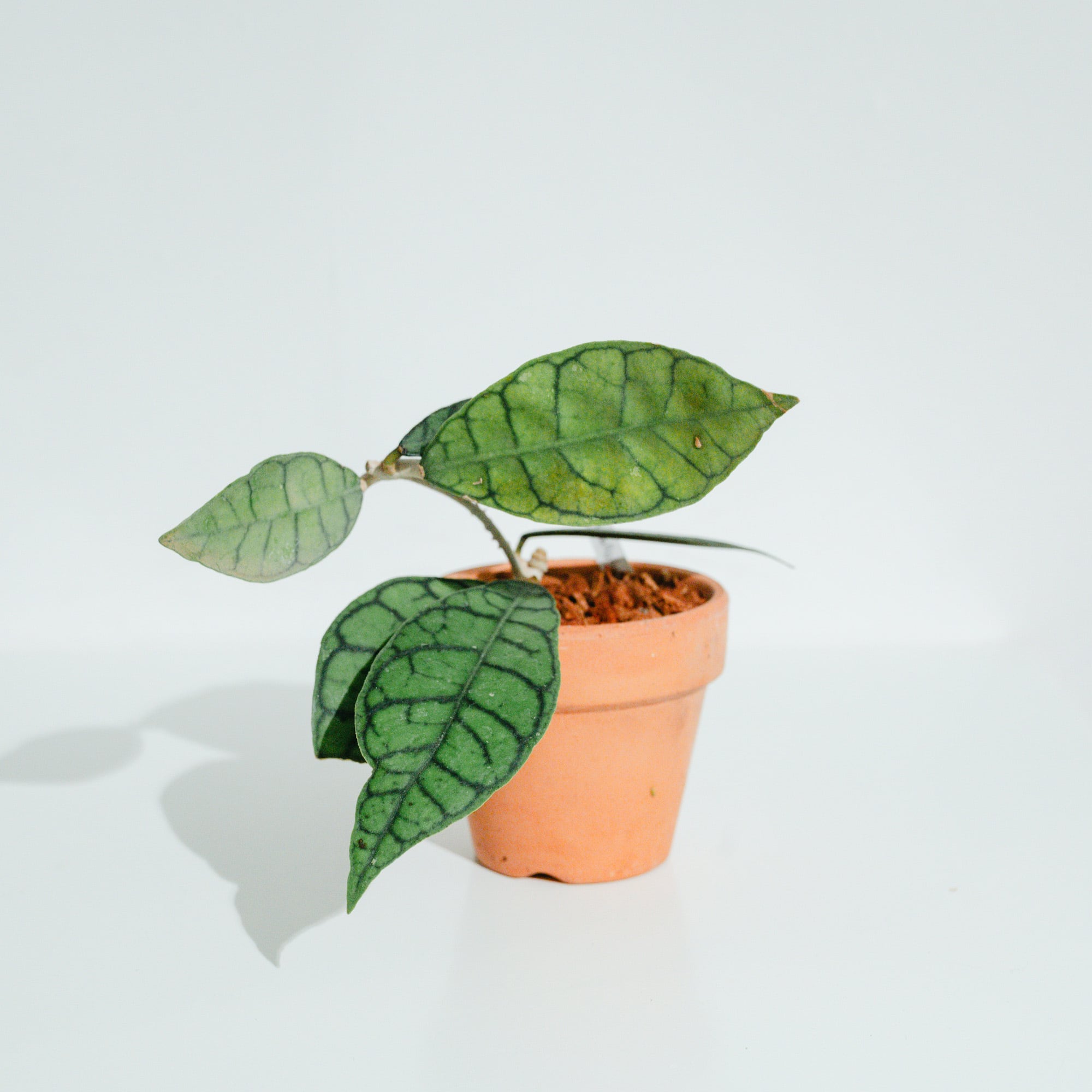 ホヤ・カリストフィラ(Hoya callistophylla)は、インドネシア・ボルネオ島を原産とする希少なホヤの一種で、肉厚の葉に走る極太の濃緑色の葉脈が印象的です。深い緑の地色と葉脈のコントラストが美しく、光の加減でより立体的に浮き上がります。花は淡いクリーム色で、甘い香りを放つ星形の小花を房状に咲かせます。