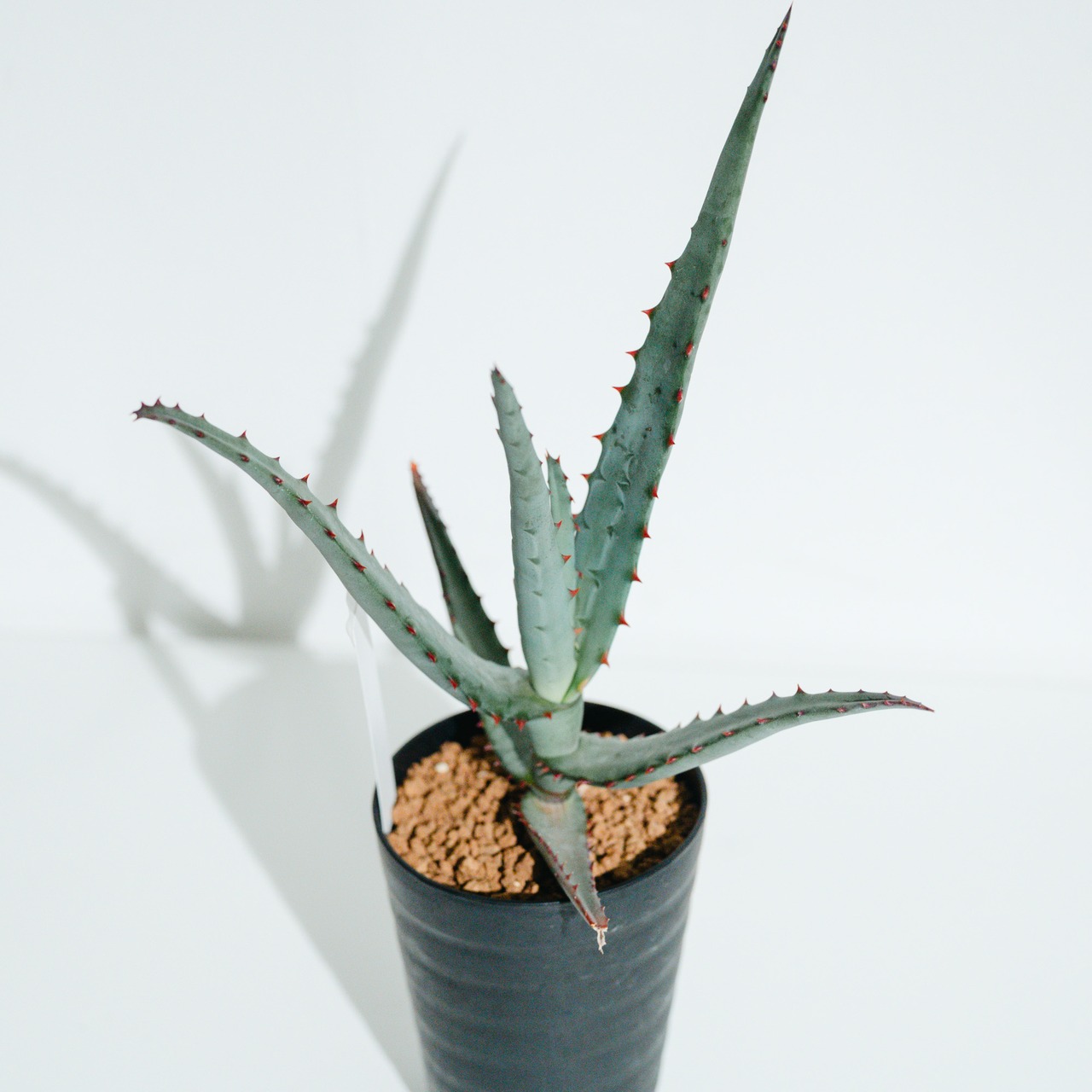 アロエ・ディバリカータ(Aloe divaricata)は、マダガスカル原産の希少種で、分岐する枝が扇状に広がる独特の樹形と、荒々しい葉の質感が魅力です。葉には棘が並び、乾いた大地に自生する力強さを感じさせるワイルドな雰囲気を持ちつつも、どこか洗練された存在感を放つ一鉢。
