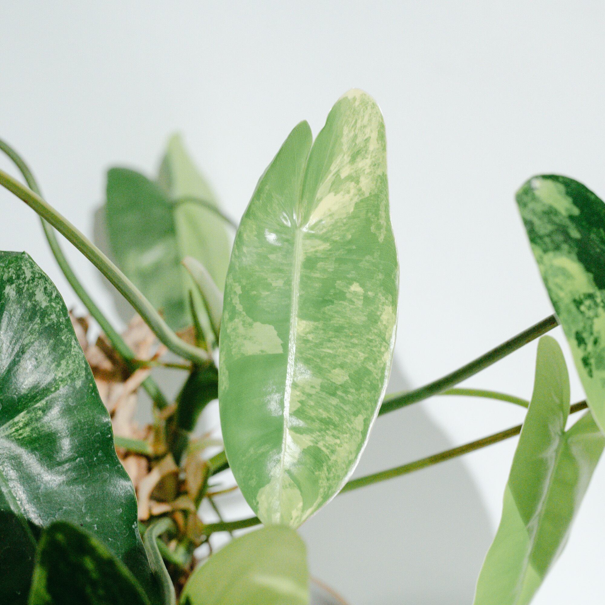 フィロデンドロン・バールマルクス 斑入りは、ブラジルを代表する世界的なランドスケープデザイナー ロベルト・バール・マルクス の名を冠したフィロデンドロンの園芸品種です。光沢ある細長い葉に、白〜クリーム色、時にライムイエローの斑がランダムに入り、一枚ごとに異なる表情を見せてくれます。成長すると茂みのようにボリュームが出て、モダンなインテリアにもナチュラルな空間にも調和する存在感のある一株です。