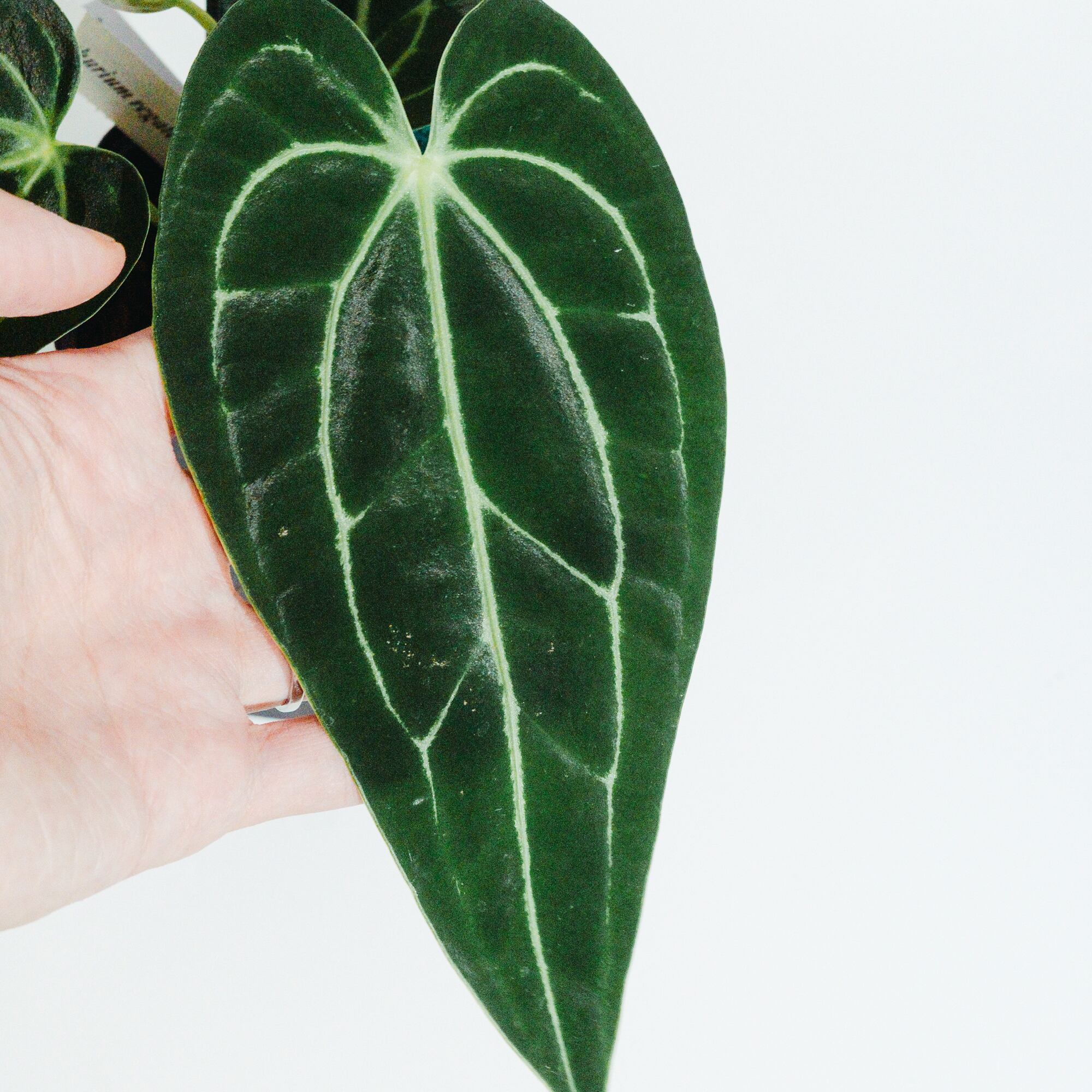 アンスリウム・レガレ(Anthurium regale)は、ペルー原産の大葉系アンスリウムで、黒みを帯びた濃緑の葉に太く際立つ白い葉脈が美しい品種です。葉はベルベットのような質感を持ち、大きなものでは1mを超える迫力あるサイズに育ちます。王冠を思わせる荘厳な雰囲気から「レガレ(=王の)」と名付けられ、コレクターにも非常に人気の高い希少種です。