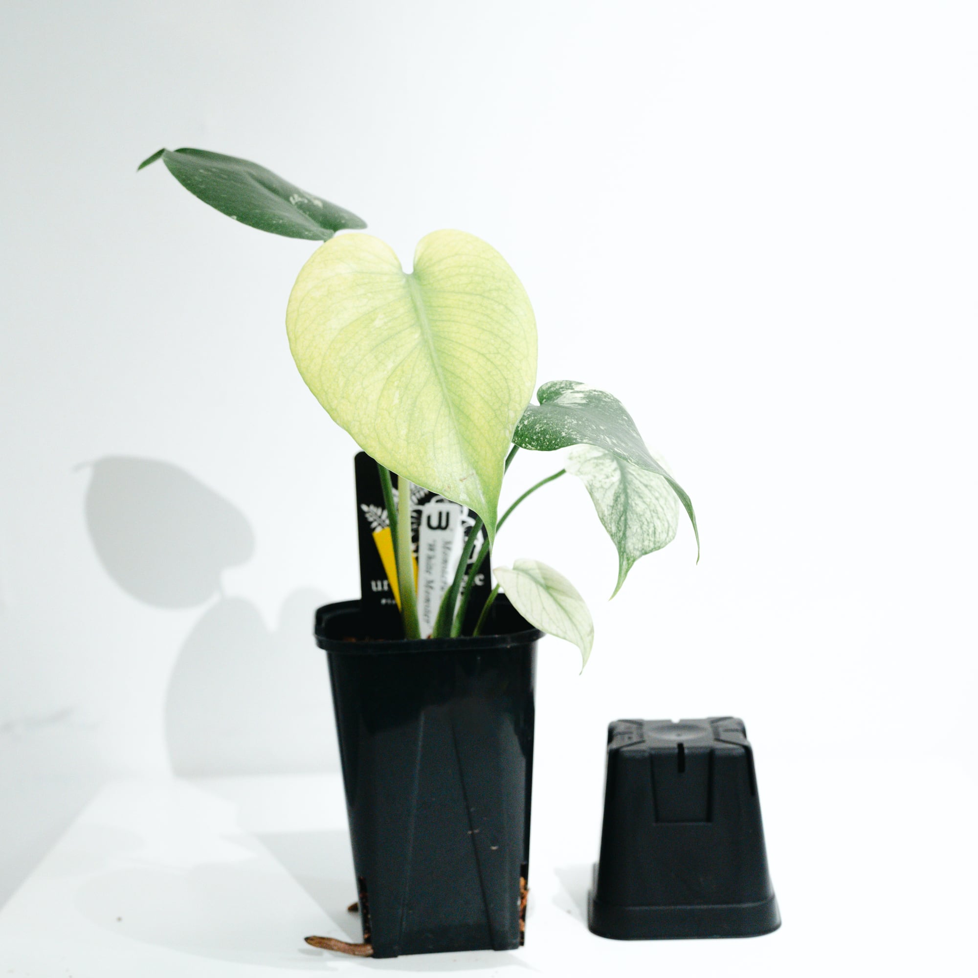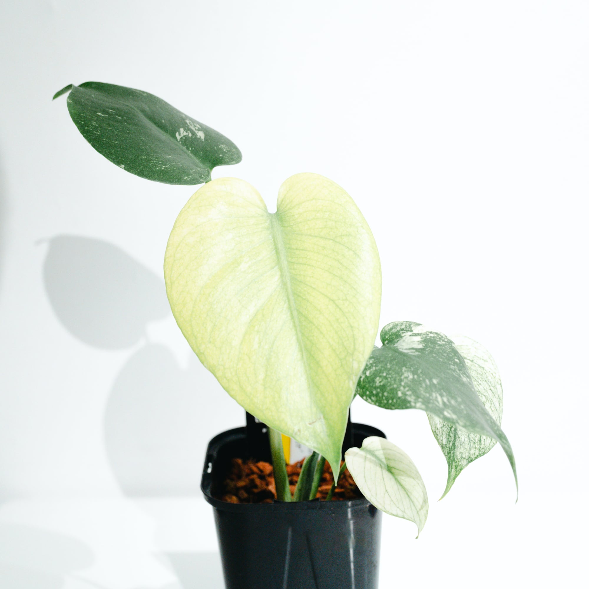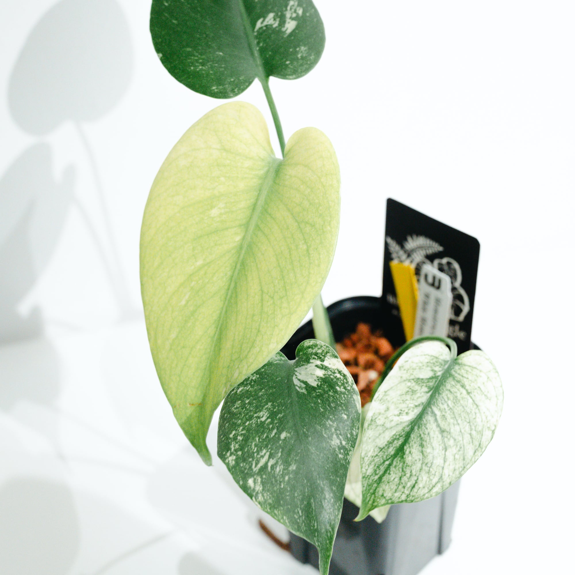 モンステラ・デリシオーサ・ホワイトモンスターは、デリシオーサの中でも極めて希少な斑入り品種で、まるで“白い怪物”の名にふさわしく、大きな葉に大胆に入る白斑が最大の魅力です。葉の切れ込みと相まって、一枚一枚がアート作品のような存在感を放ちます。育てるごとに異なる模様が現れるため、時間とともに唯一無二の表情を楽しめる逸品です。
