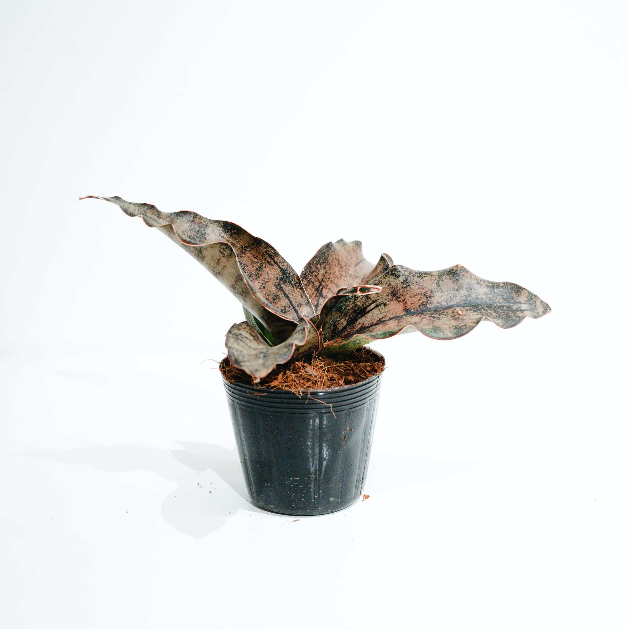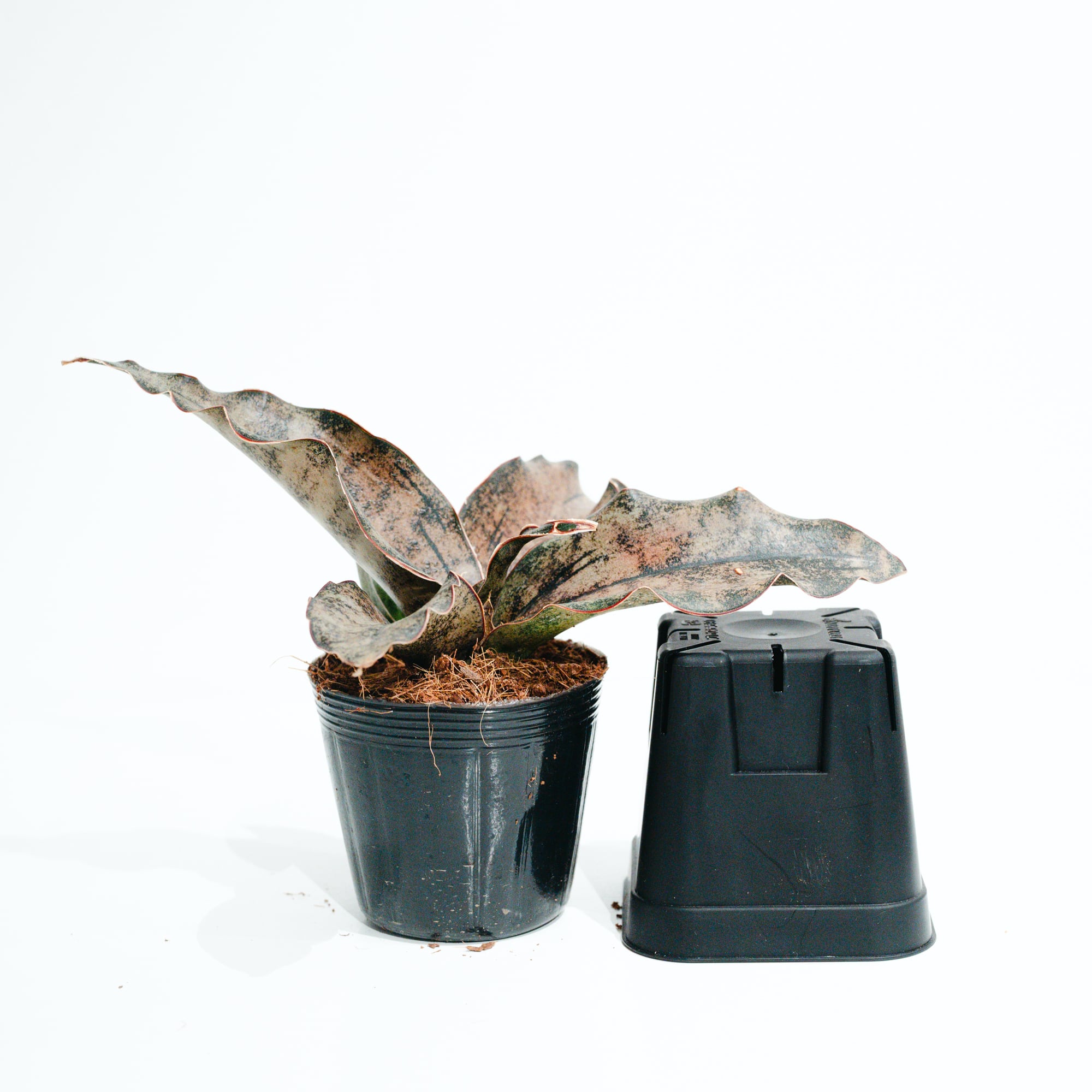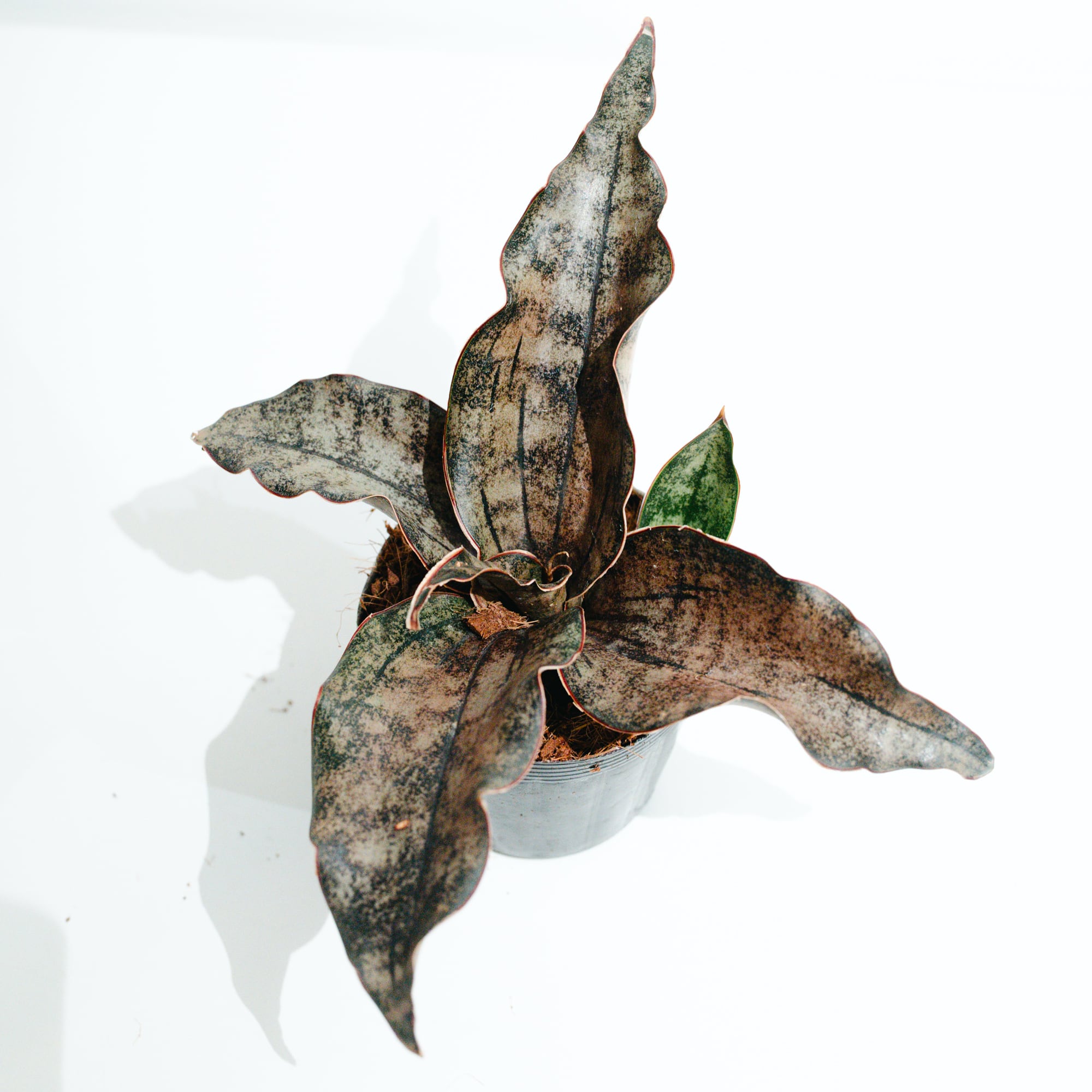 サンセベリア・キルキー・コパトーンは、サンセベリア・キルキーの選抜品種で、葉に現れる銅色(コパー)の色合いが特徴的な個性派サンセベリアです。厚みのある幅広の葉は、波打つような縁と独特の斑模様を持ち、光の当たり方によってブロンズ〜グリーンへと表情を変えます。一般的なサンセベリアとは一線を画す造形美があり、インテリアグリーンとして存在感のある一株です。
