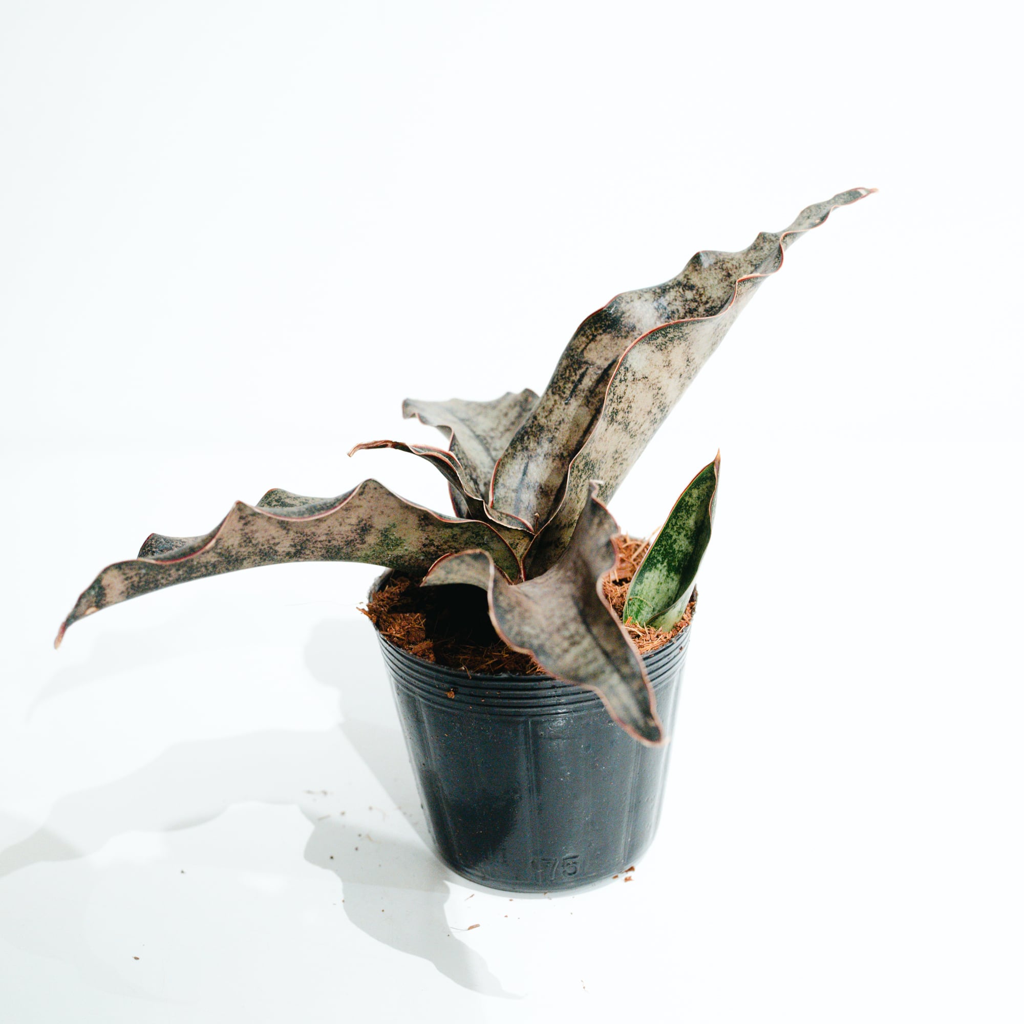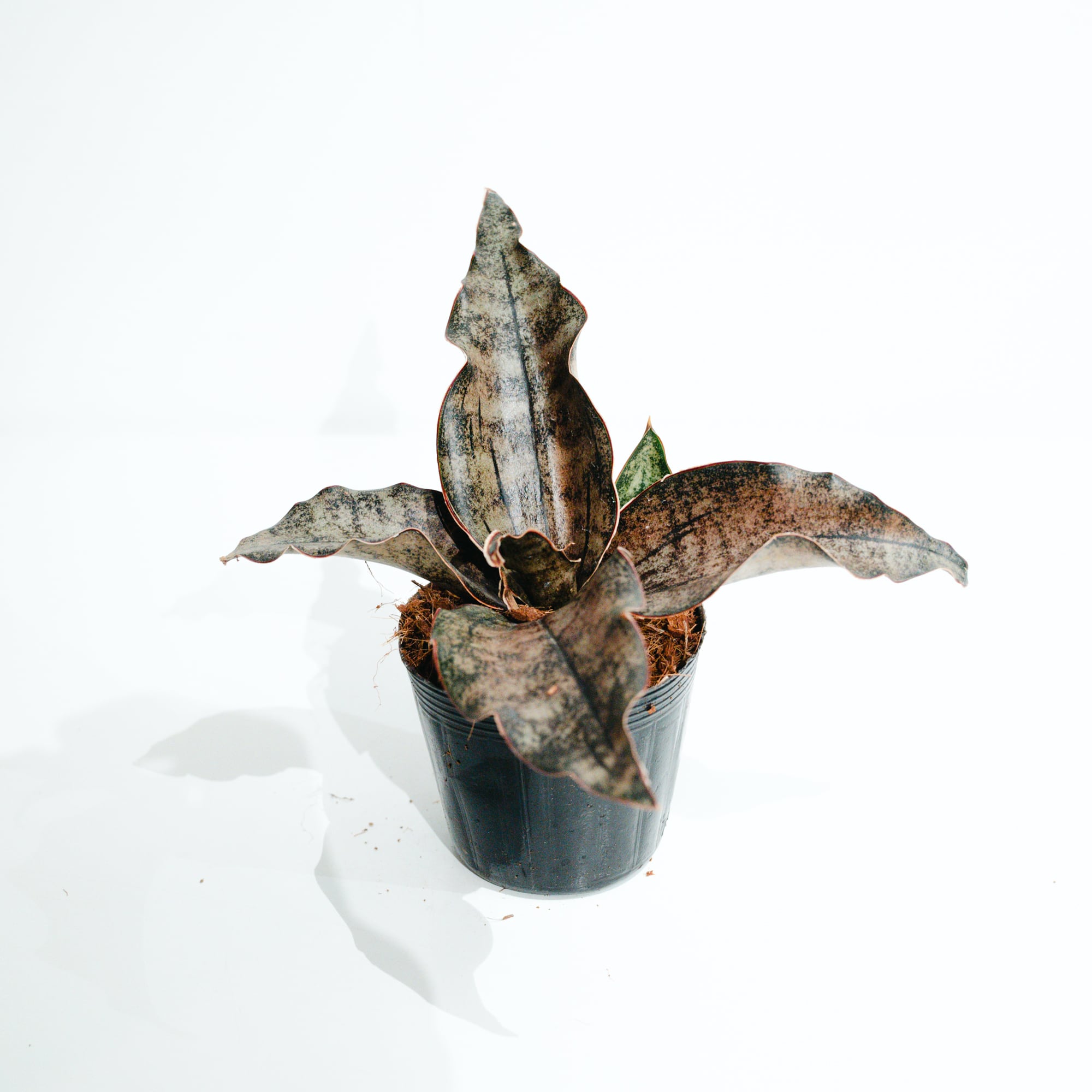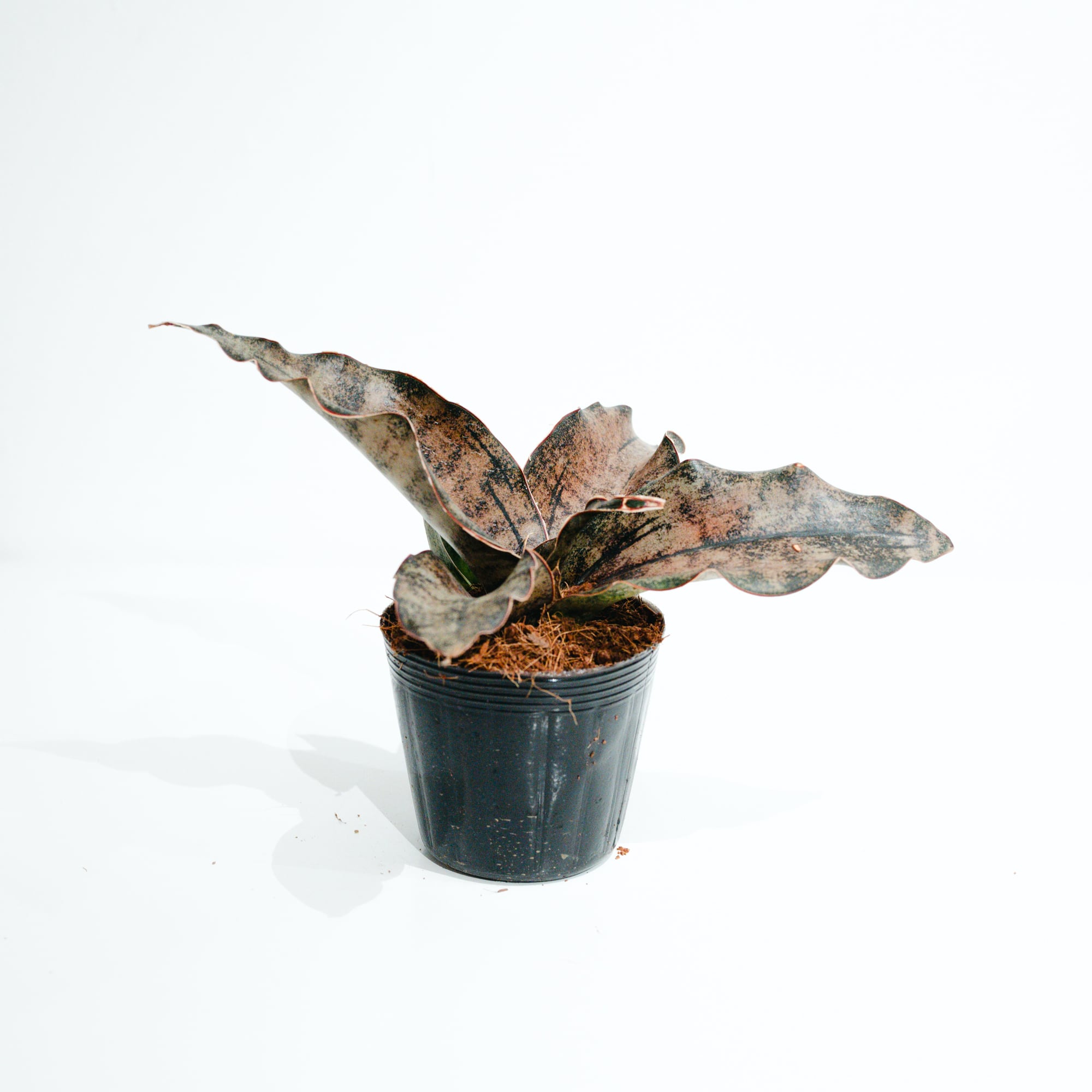 サンセベリア・キルキー・コパトーンは、サンセベリア・キルキーの選抜品種で、葉に現れる銅色(コパー)の色合いが特徴的な個性派サンセベリアです。厚みのある幅広の葉は、波打つような縁と独特の斑模様を持ち、光の当たり方によってブロンズ〜グリーンへと表情を変えます。一般的なサンセベリアとは一線を画す造形美があり、インテリアグリーンとして存在感のある一株です。