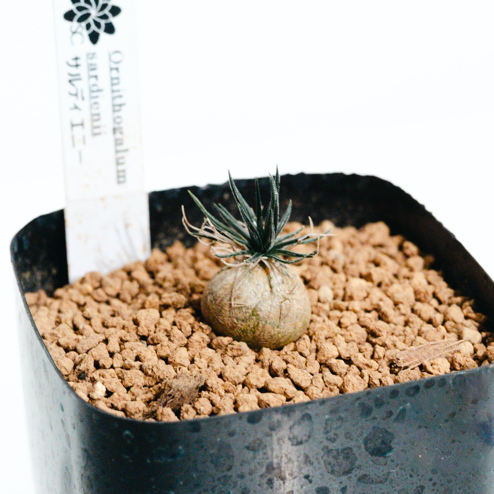 オーニソガラム・サルディエニーは、南アフリカ原産のケープバルブ(球根植物)の一種です。最大の特徴は、成長とともに分球し、群生していく小さな「玉ねぎ状」の鱗茎(球根)です。その球根から、針のように細く繊細な銀緑色の葉を密に茂らせる姿は、まるでミニチュアの盆栽のような趣があります。