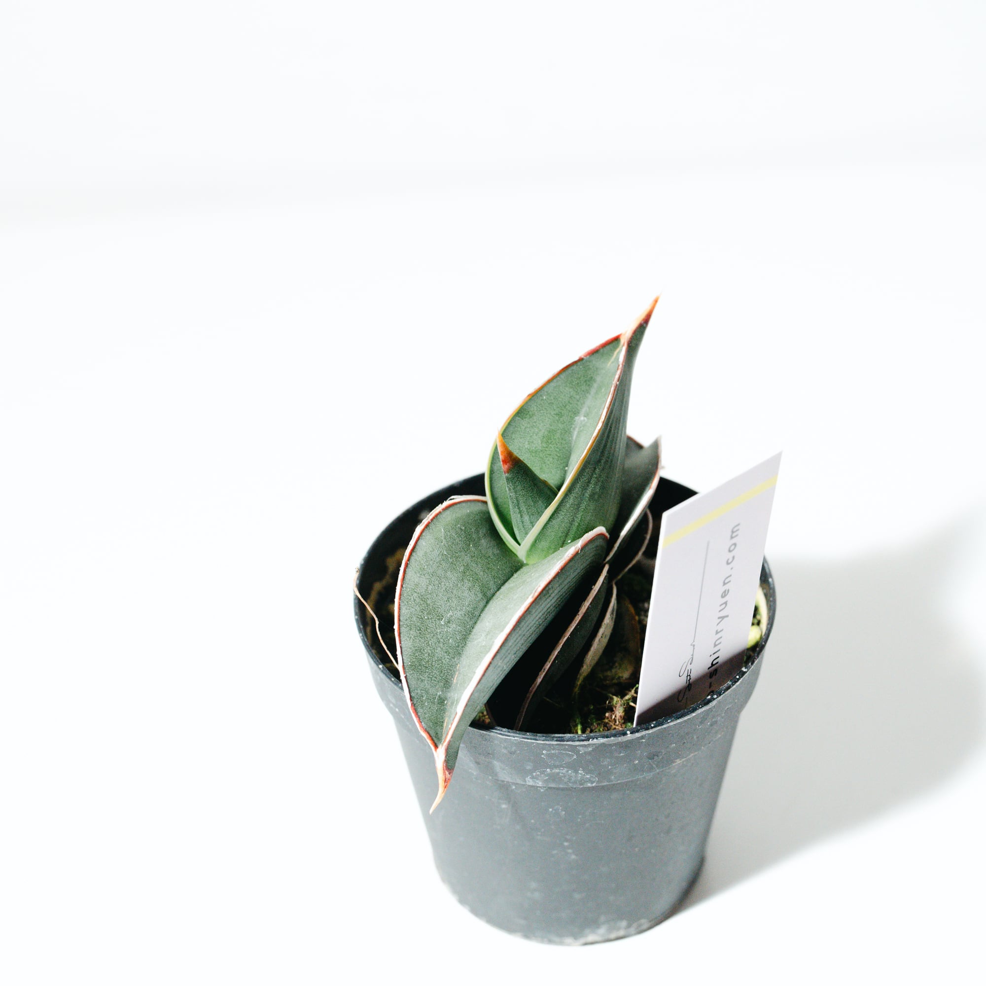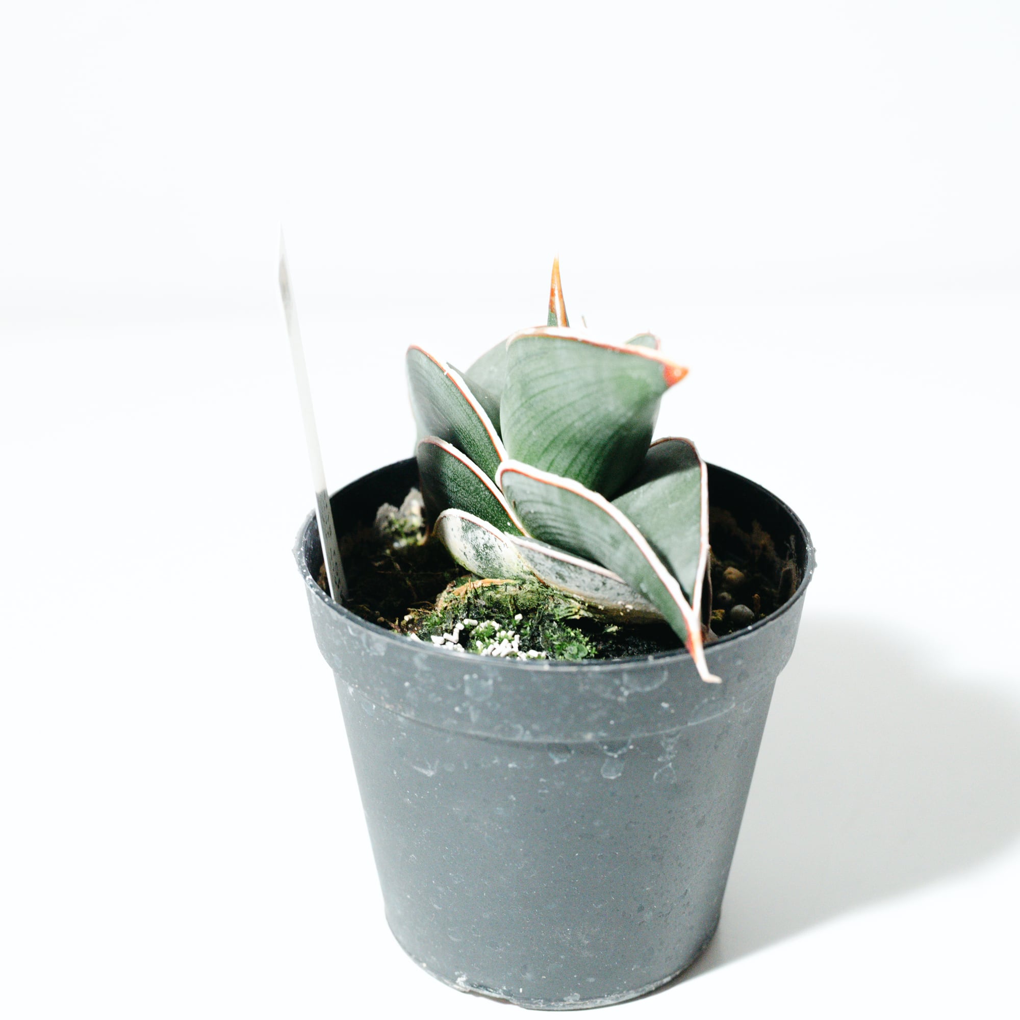 サンセベリア・ロリダは、「サンセベリアの王様」とも称される希少性の高い人気品種です。扇状に美しく重なり合う肉厚の葉が特徴で、その重厚感あふれるフォルムはまさに自然の造形美。成長が非常にゆっくりであることから流通量が少なく、コレクターズアイテムとしても知られています。青みがかった銀緑色の葉の縁には、赤茶色のラインと白く鋭いエッジが入り、ワイルドながらも気品漂う佇まいが魅力です。