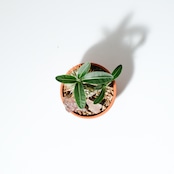 パキポディウム・エブレネウムは、マダガスカル原産の塊根植物(コーデックス)の中でも、白く滑らかな肌質と横に広がるぽってりとしたフォルムが人気の希少種です。種小名の「eburneum」は「象牙色の」という意味を持ち、その名の通り美しい白い幹肌が特徴。パキポディウムの中でも比較的コンパクトに育ち、春には白からクリーム色の気品ある花を咲かせます。トゲと葉のコントラスト、そして塊根部が生み出す独特の重厚感は、インテリアグリーンとしても圧倒的な存在感を放ちます。