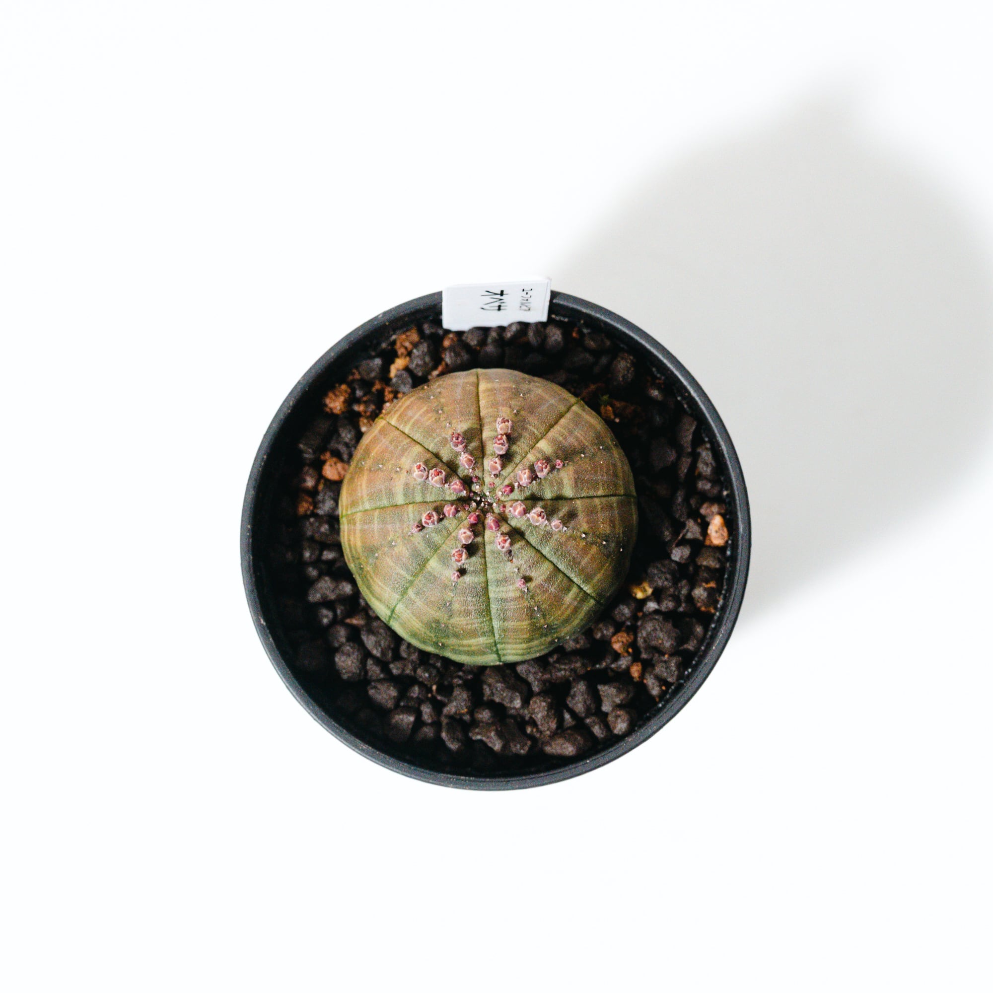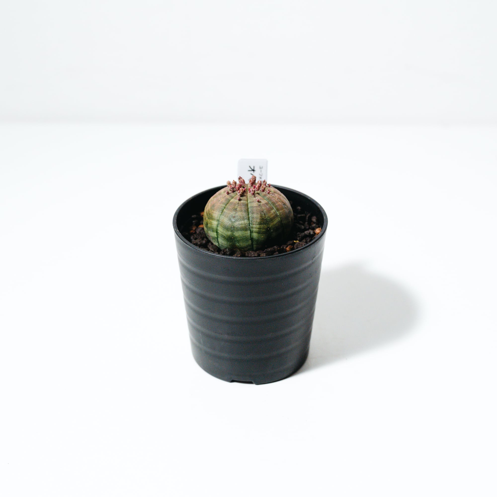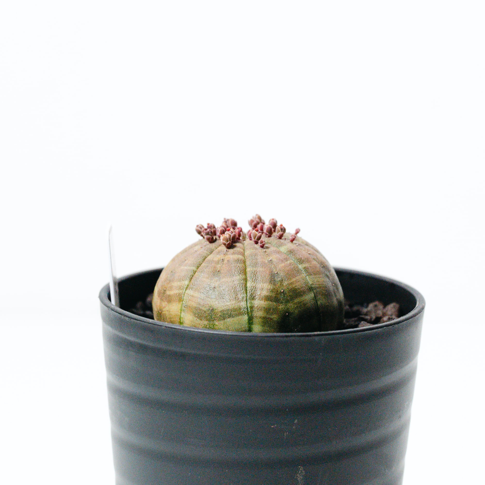 若いうちは真ん丸なボール状ですが、成長とともに少しずつ円筒形へと姿を変え、年月を経て表面が木のように質感が変わる「木質化」も、オベサ栽培の大きな醍醐味です。インテリア性が非常に高く、モダンな鉢と合わせることでより一層その造形美が際立ちます。