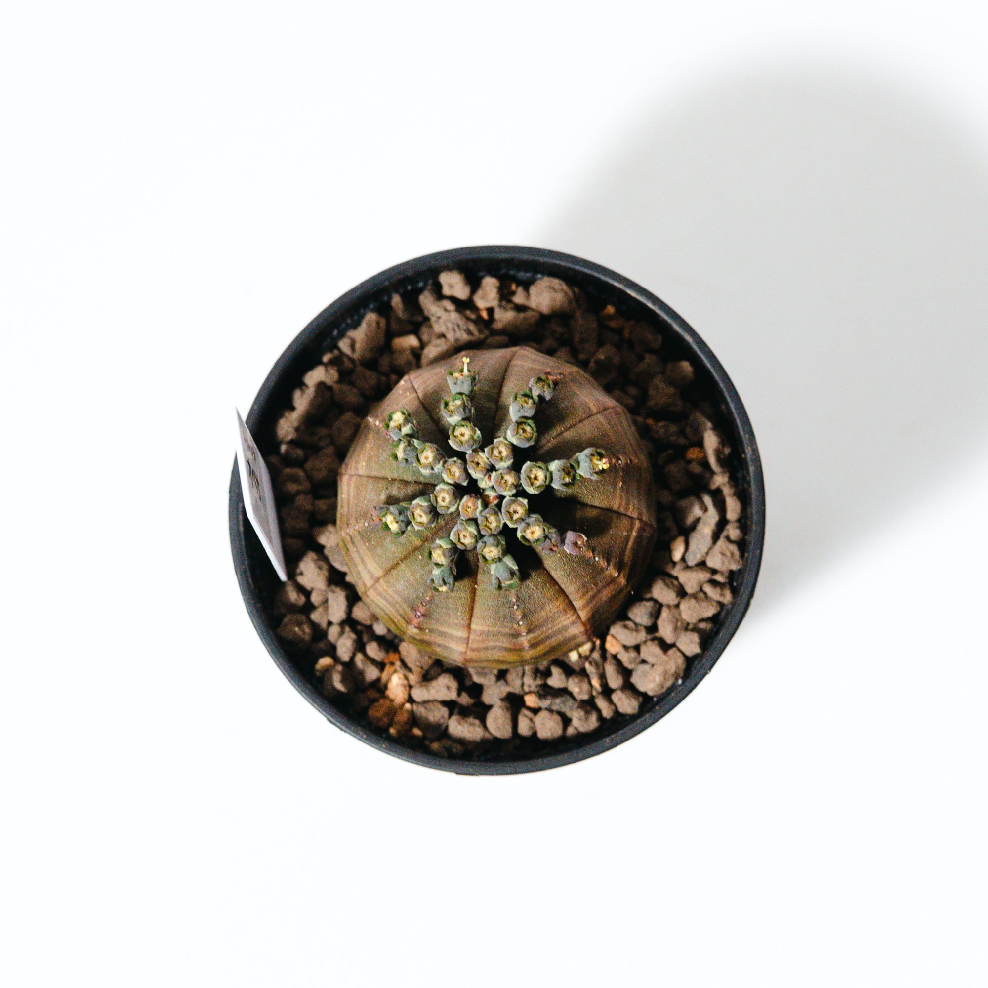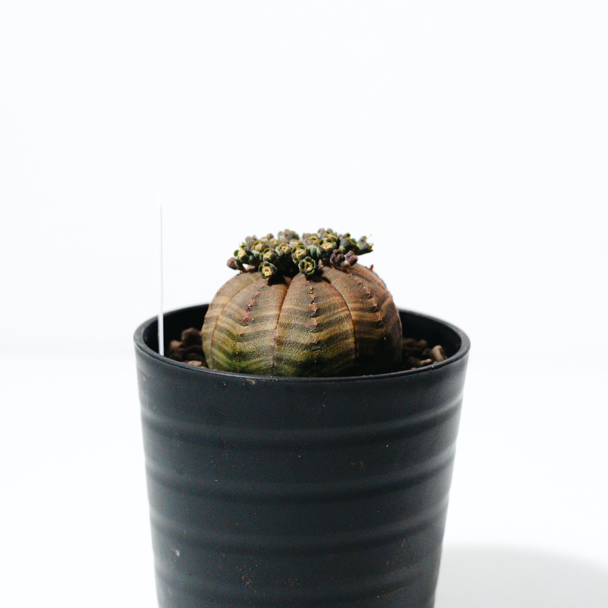 若いうちは真ん丸なボール状ですが、成長とともに少しずつ円筒形へと姿を変え、年月を経て表面が木のように質感が変わる「木質化」も、オベサ栽培の大きな醍醐味です。インテリア性が非常に高く、モダンな鉢と合わせることでより一層その造形美が際立ちます。