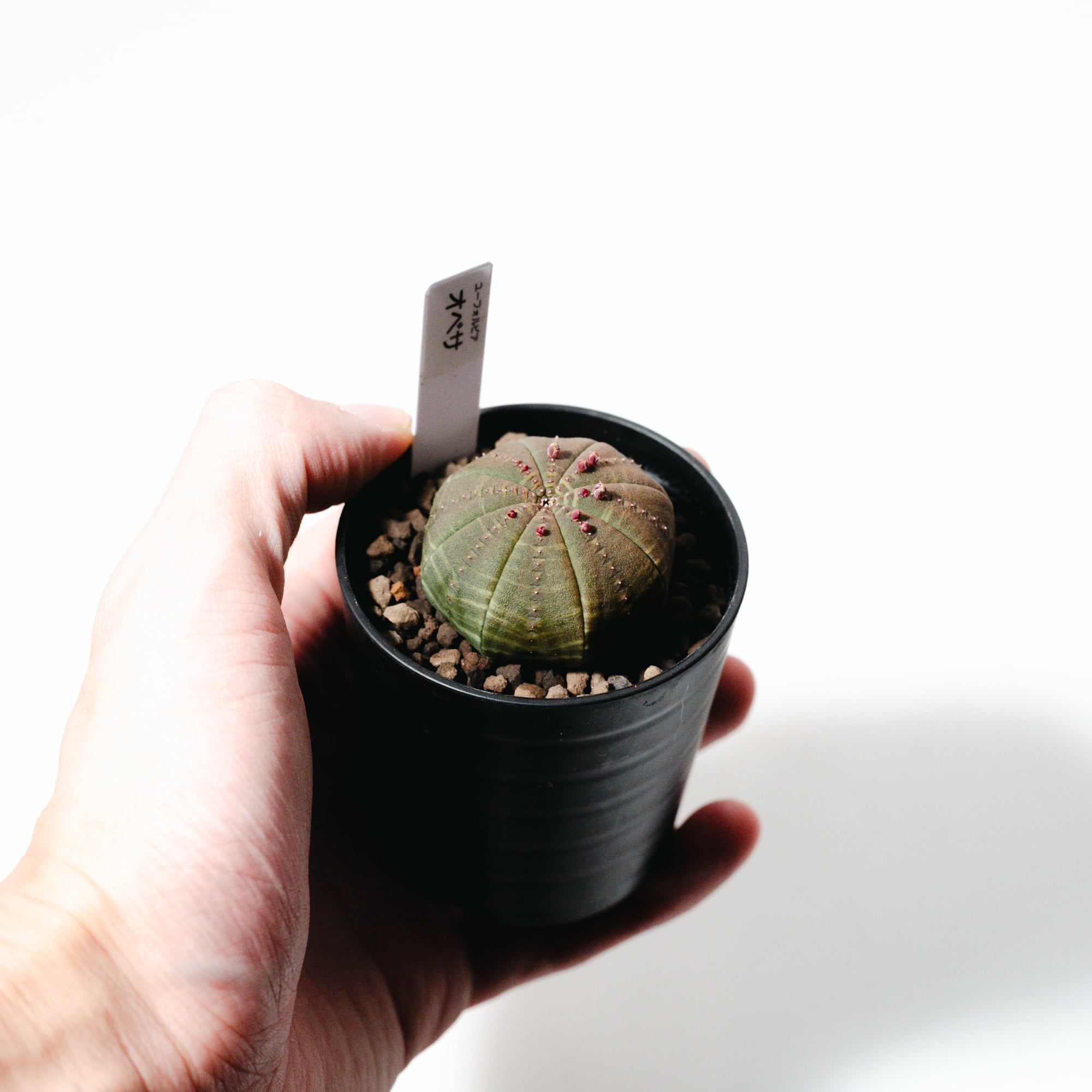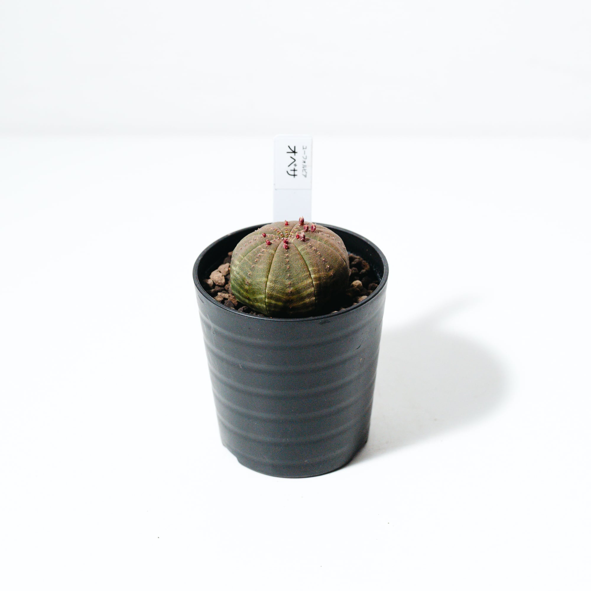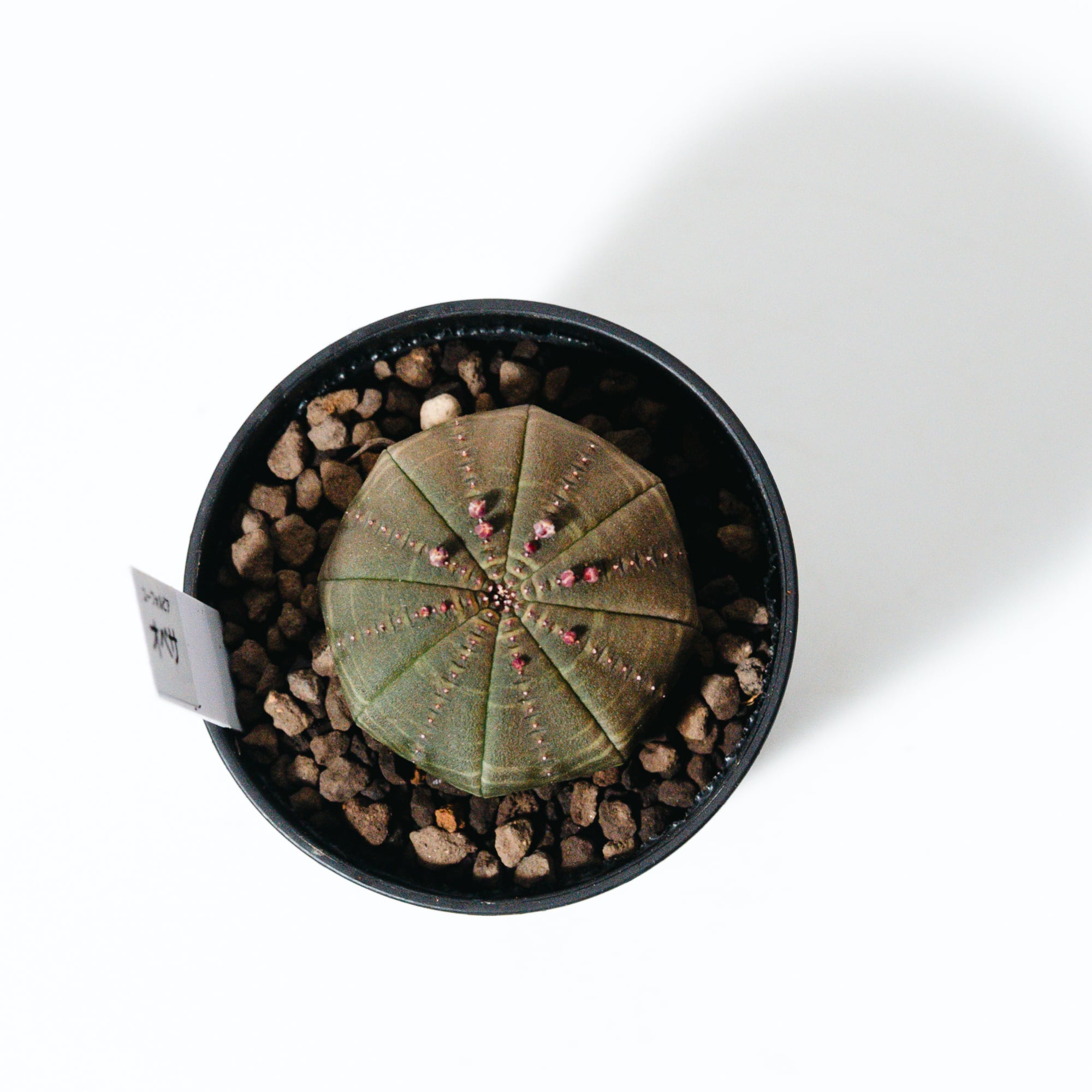 若いうちは真ん丸なボール状ですが、成長とともに少しずつ円筒形へと姿を変え、年月を経て表面が木のように質感が変わる「木質化」も、オベサ栽培の大きな醍醐味です。インテリア性が非常に高く、モダンな鉢と合わせることでより一層その造形美が際立ちます。