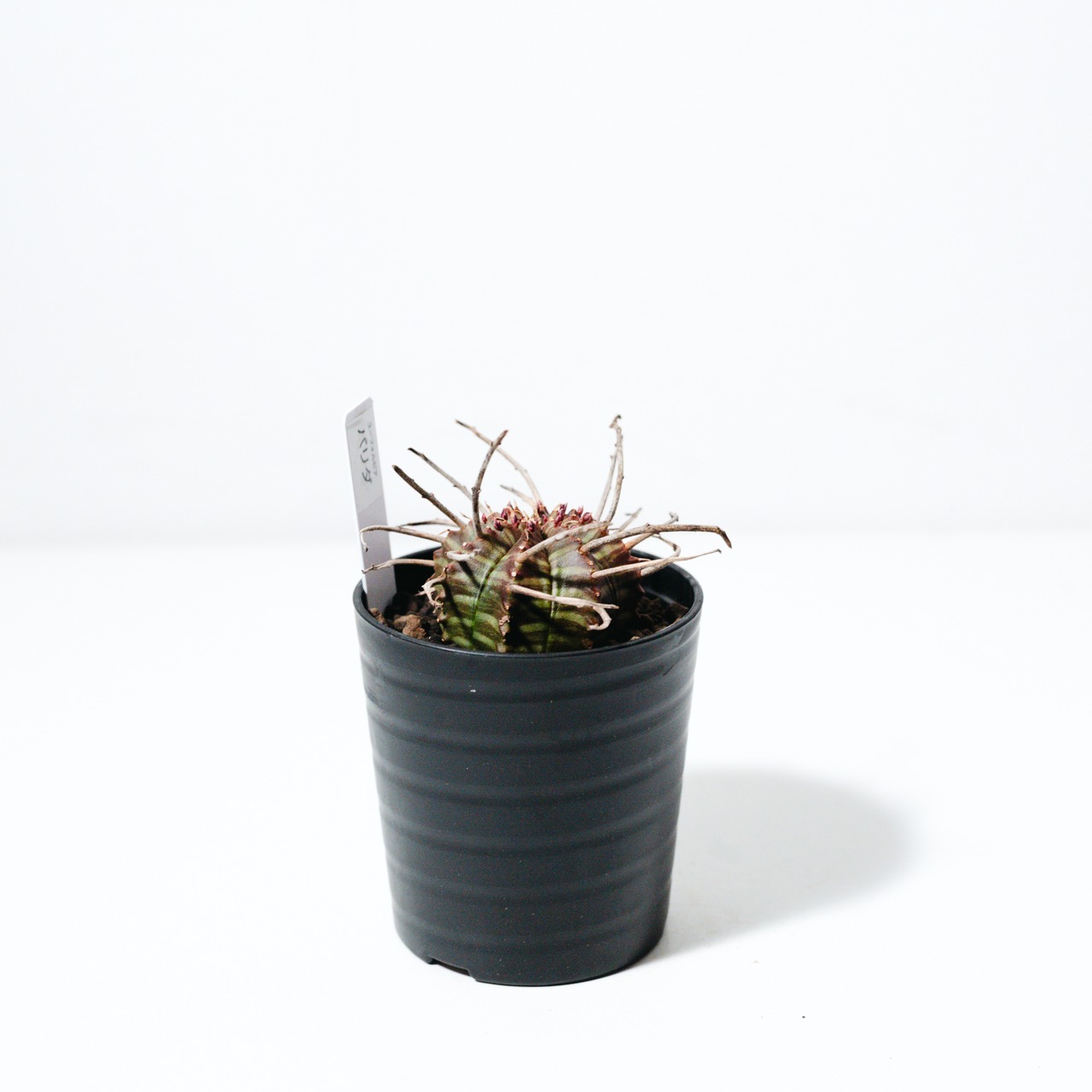 ユーフォルビア・バリダは、南アフリカ原産の球状ユーフォルビアで、オベサと並び絶大な人気を誇る品種です。最大の特徴は、花が咲いた後の「花柄(かきょう)」が枯れてトゲのように残り、幾何学的な球体に野生味あふれる表情を添える点にあります。