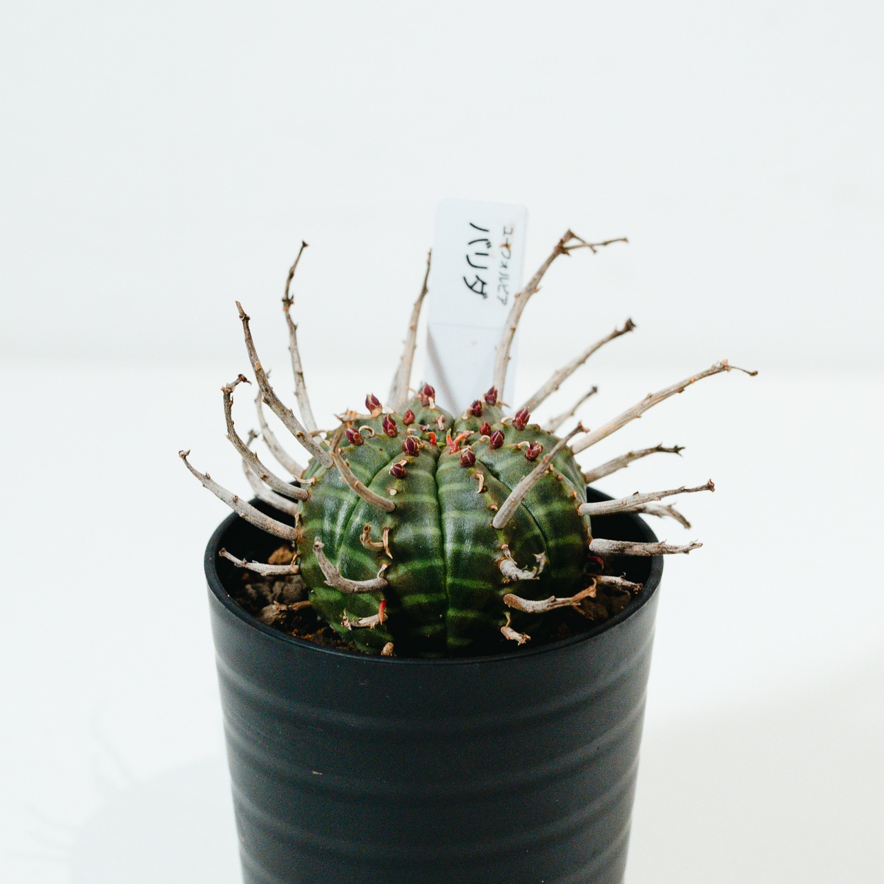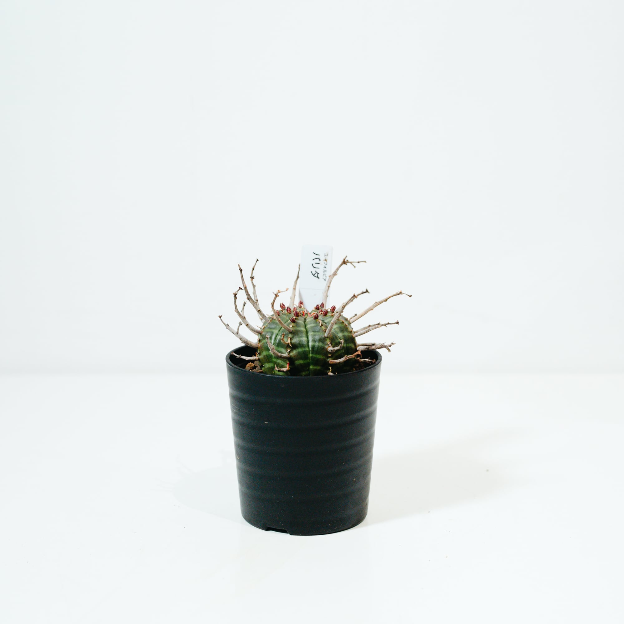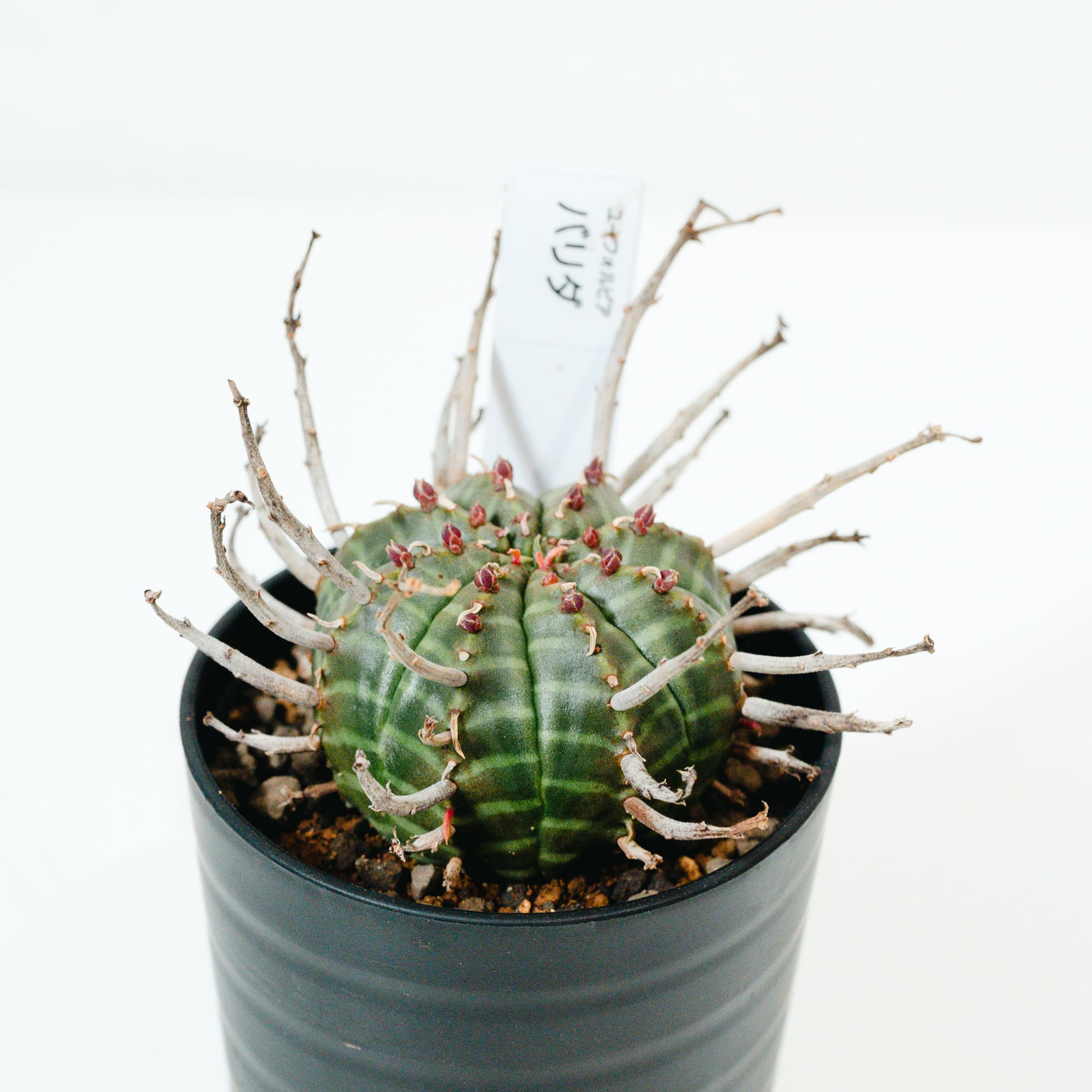 ユーフォルビア・バリダは、南アフリカ原産の球状ユーフォルビアで、オベサと並び絶大な人気を誇る品種です。最大の特徴は、花が咲いた後の「花柄(かきょう)」が枯れてトゲのように残り、幾何学的な球体に野生味あふれる表情を添える点にあります。