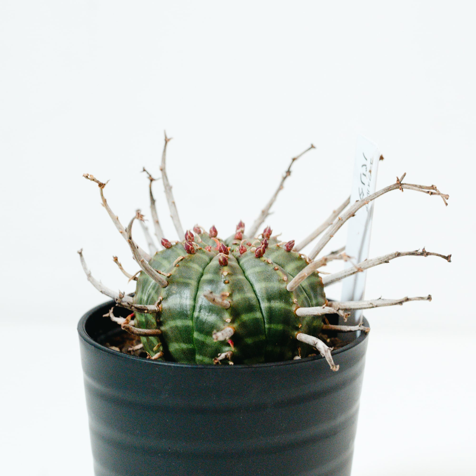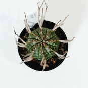 成長とともにこの花殻が重なり合い、王冠のような力強いシルエットへと進化します。葉を持たないミニマルな姿ながら、表面に現れる鮮明な縞模様(ゼブラ柄)は非常に美しく、まさに「機能美」を体現したような植物です。成長はゆっくりですが、その分、時間をかけて自分だけの一株に育てる喜びを味わえます。