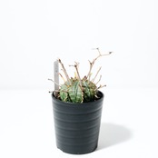 成長とともにこの花殻が重なり合い、王冠のような力強いシルエットへと進化します。葉を持たないミニマルな姿ながら、表面に現れる鮮明な縞模様(ゼブラ柄)は非常に美しく、まさに「機能美」を体現したような植物です。成長はゆっくりですが、その分、時間をかけて自分だけの一株に育てる喜びを味わえます。