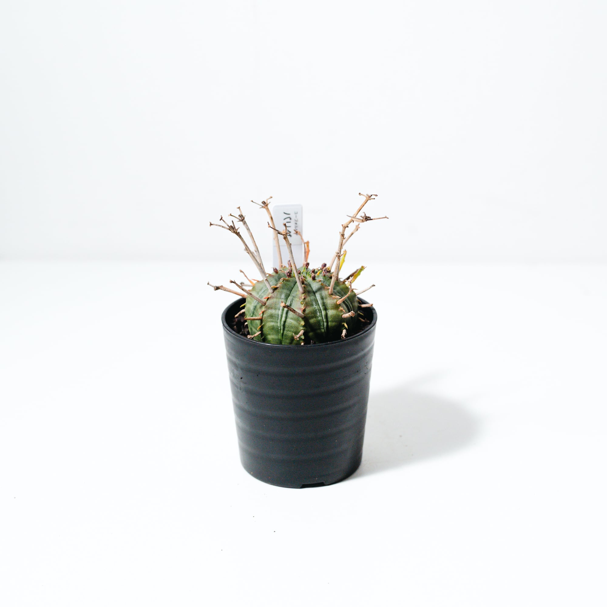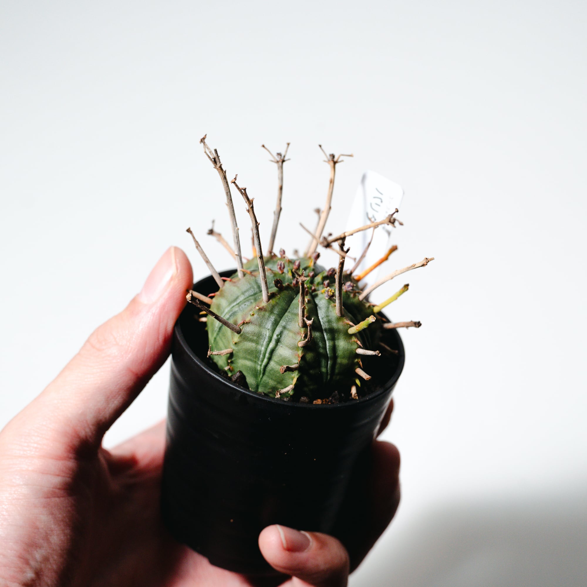 ユーフォルビア・バリダは、南アフリカ原産の球状ユーフォルビアで、オベサと並び絶大な人気を誇る品種です。最大の特徴は、花が咲いた後の「花柄(かきょう)」が枯れてトゲのように残り、幾何学的な球体に野生味あふれる表情を添える点にあります。