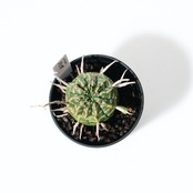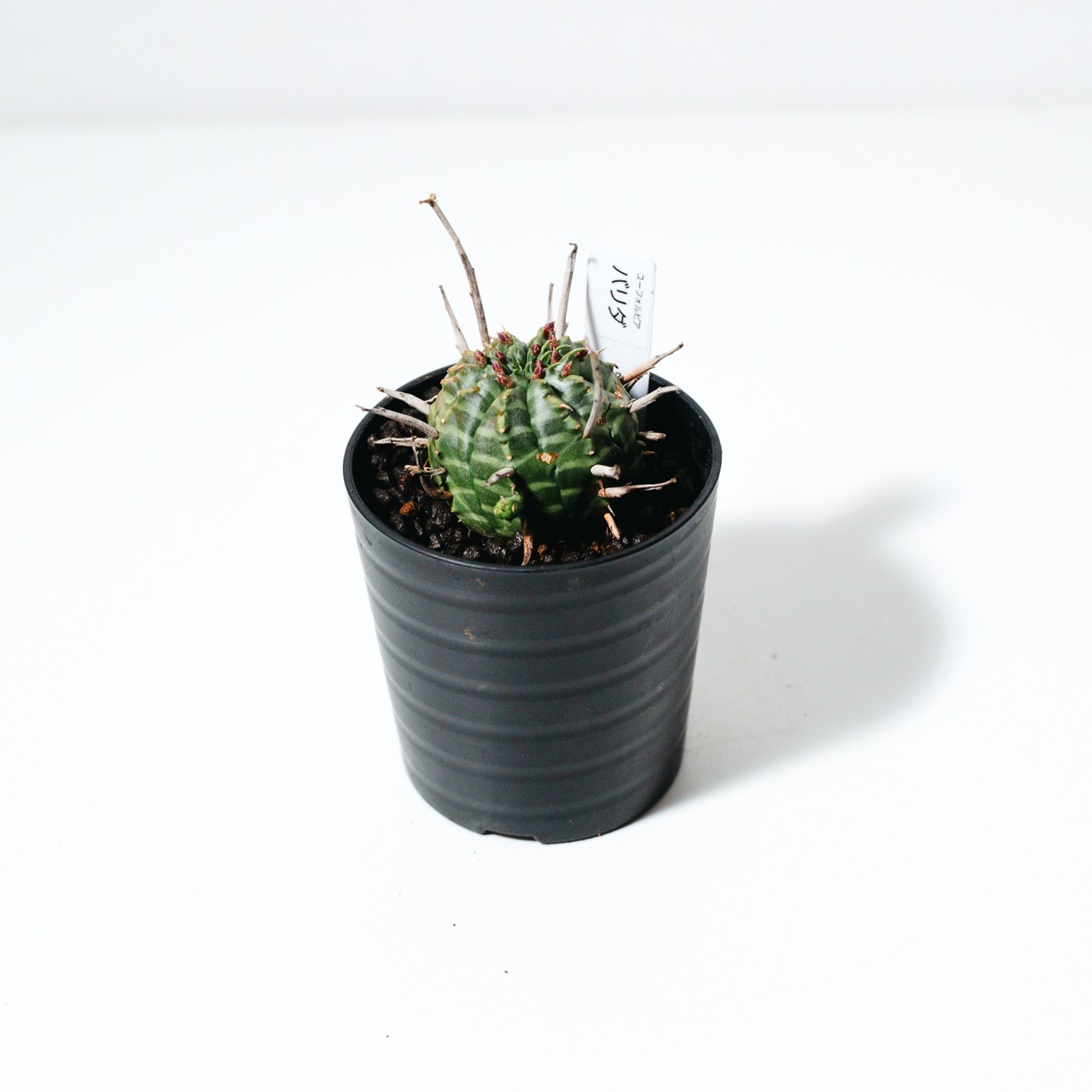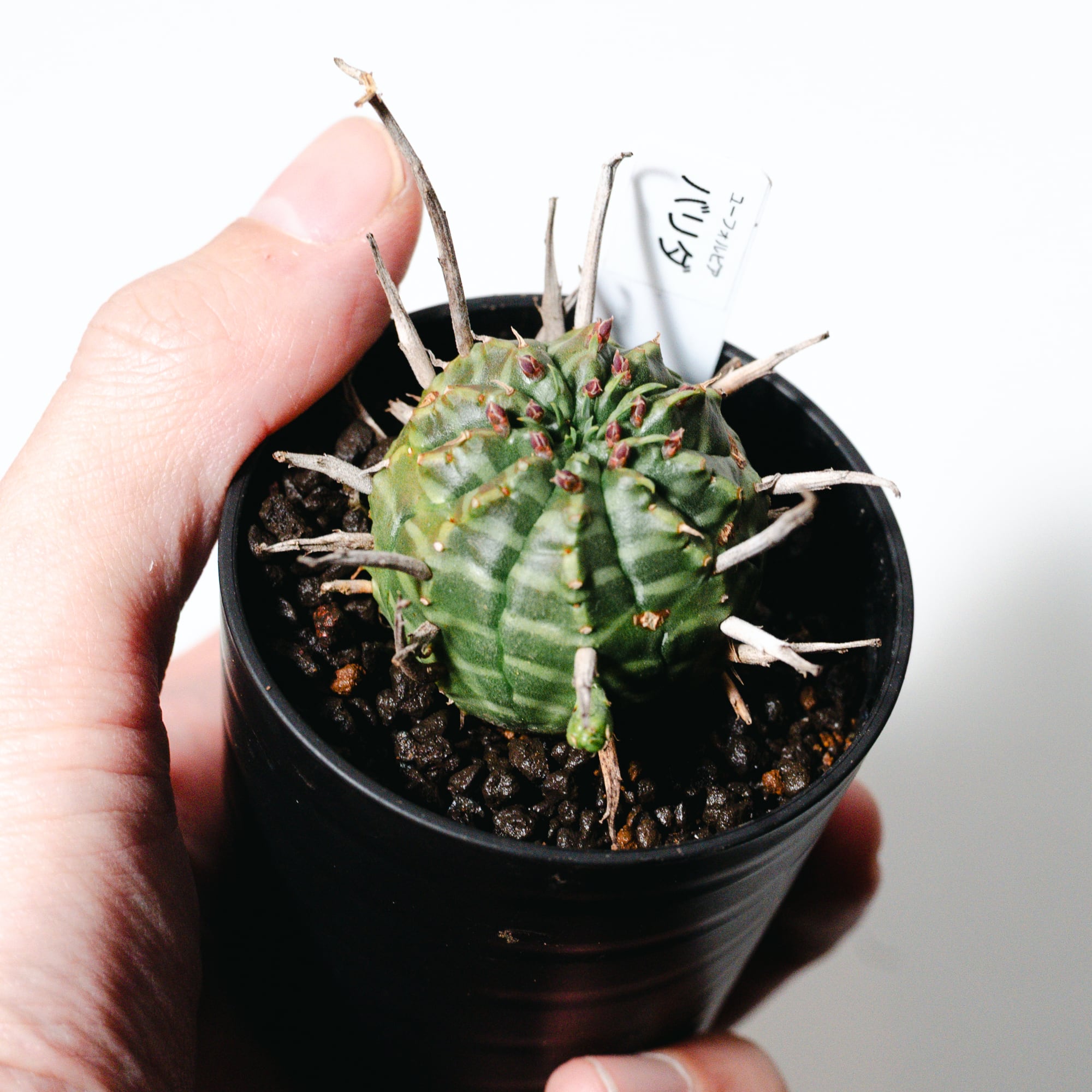 ユーフォルビア・バリダは、南アフリカ原産の球状ユーフォルビアで、オベサと並び絶大な人気を誇る品種です。最大の特徴は、花が咲いた後の「花柄(かきょう)」が枯れてトゲのように残り、幾何学的な球体に野生味あふれる表情を添える点にあります。
