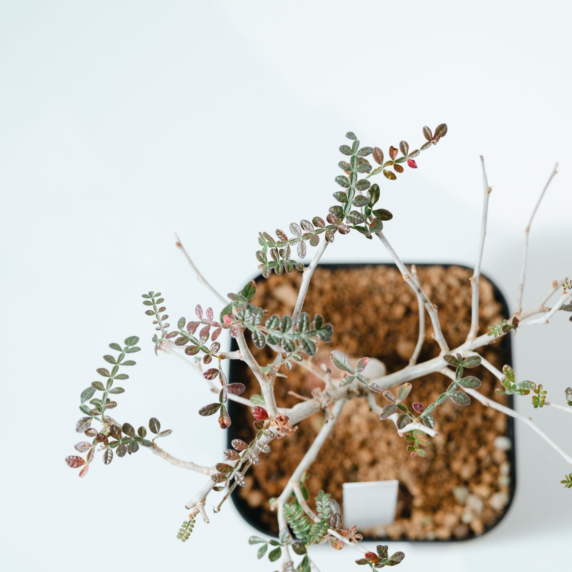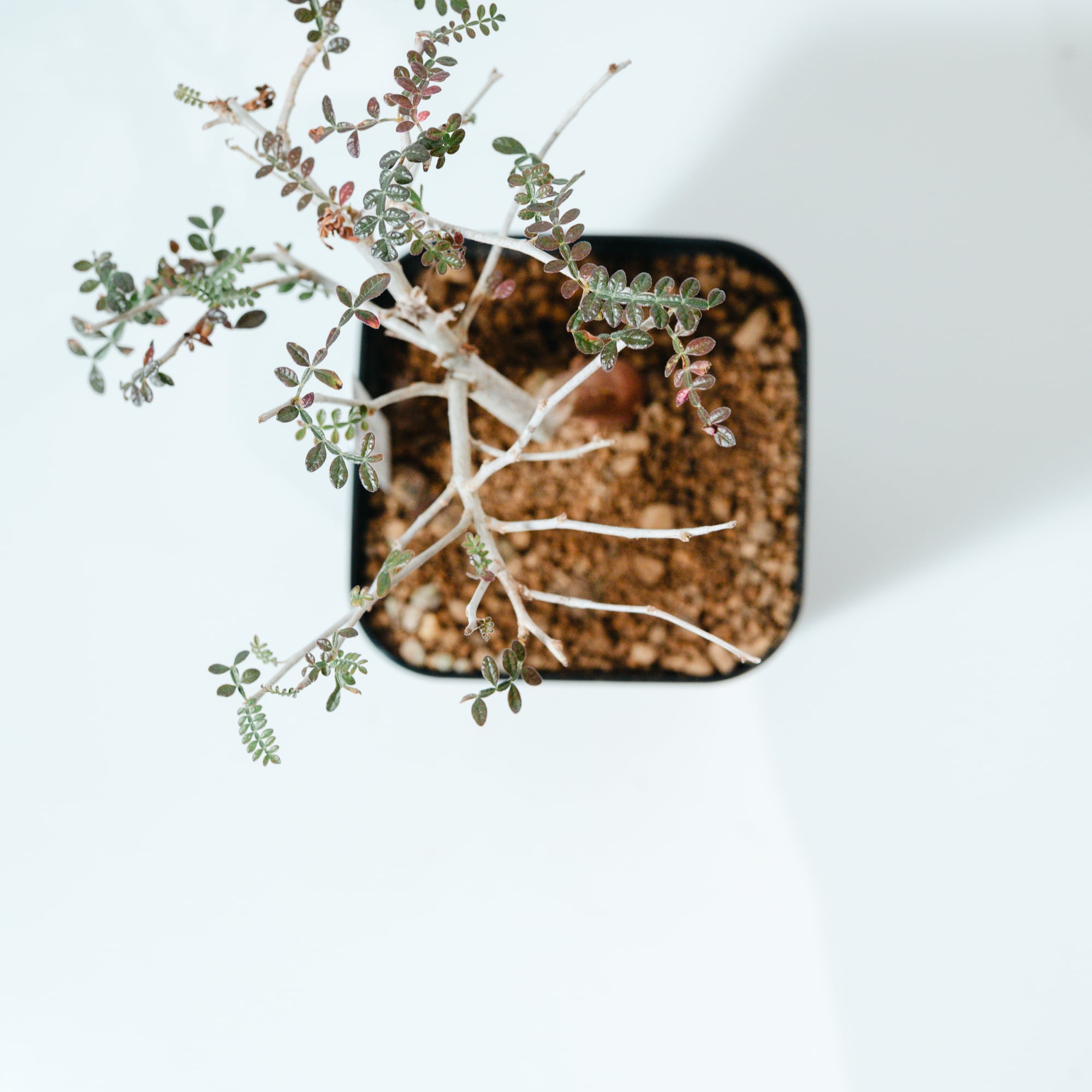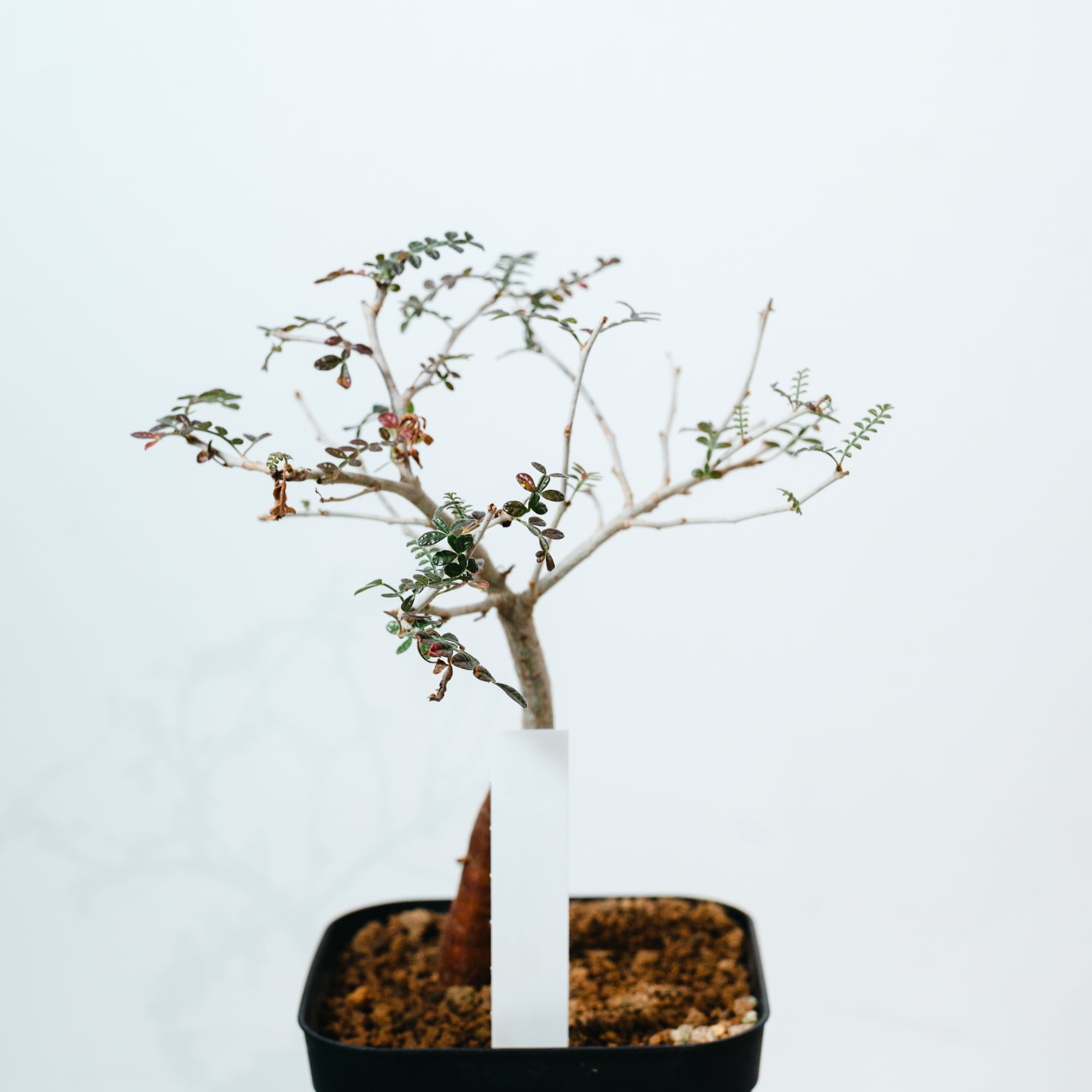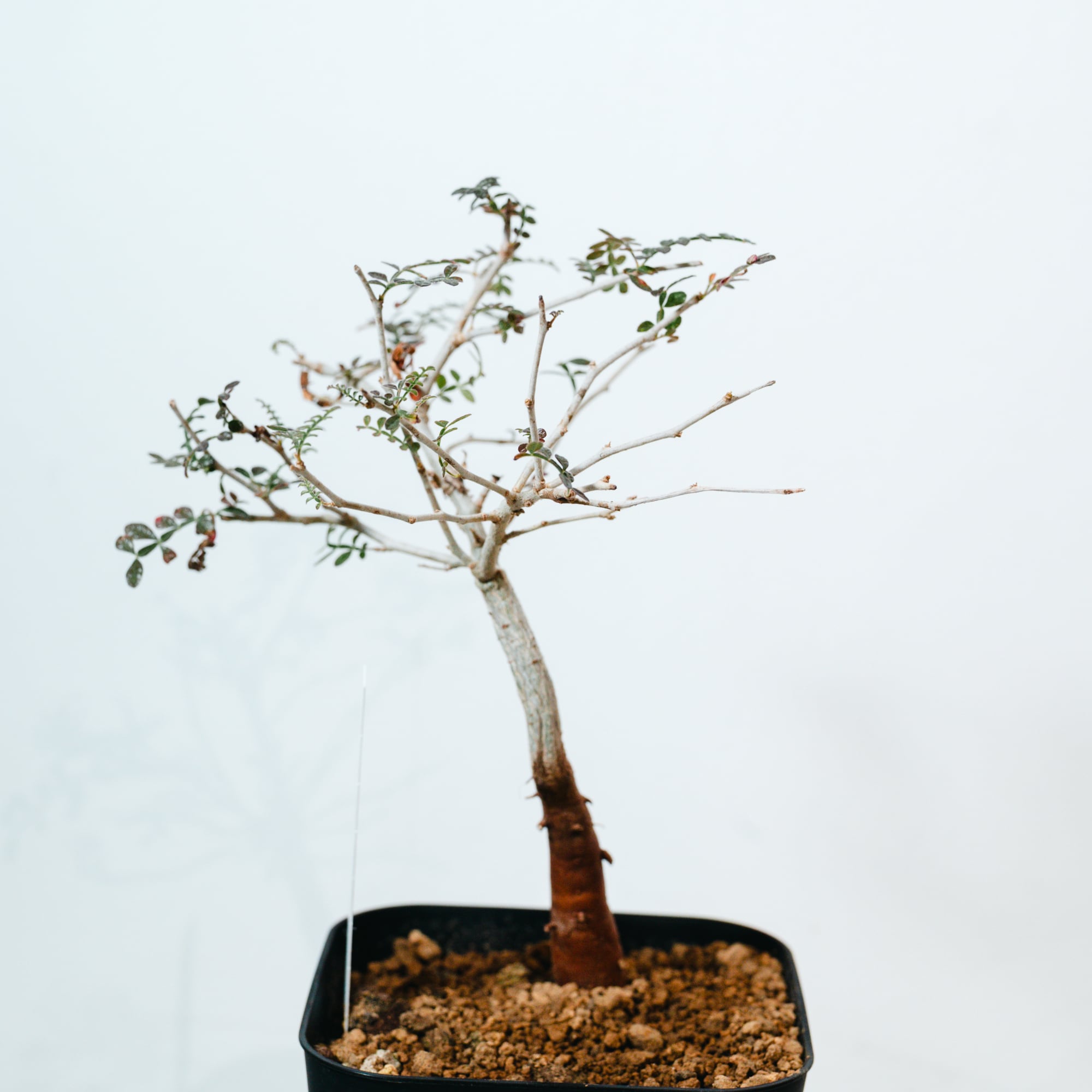 最大の特徴は、小さな羽状複葉の表面に繊細な「うぶ毛」が生える点で、光に透けると柔らかく幻想的な表情を見せてくれます。成長と共に幹がゴツゴツとした質感に変化し、盆栽のような風格ある佇まいへと育つ、非常にコレクション性の高い一株です。