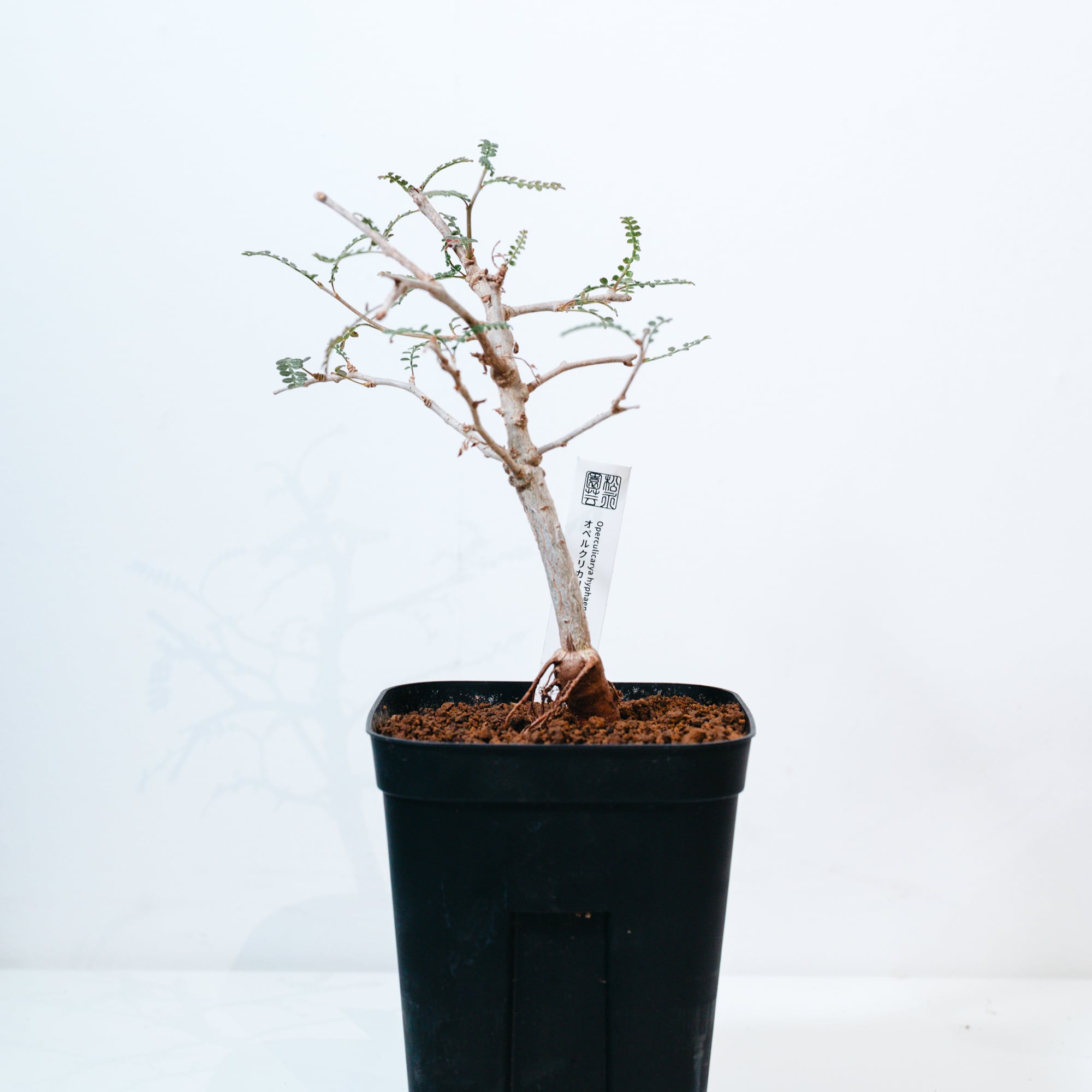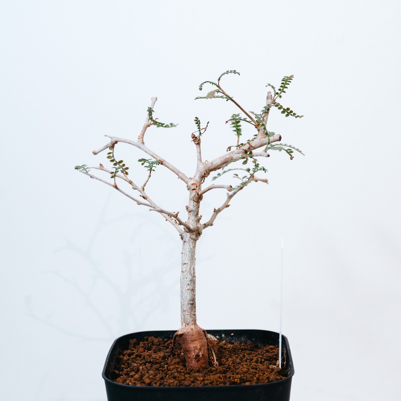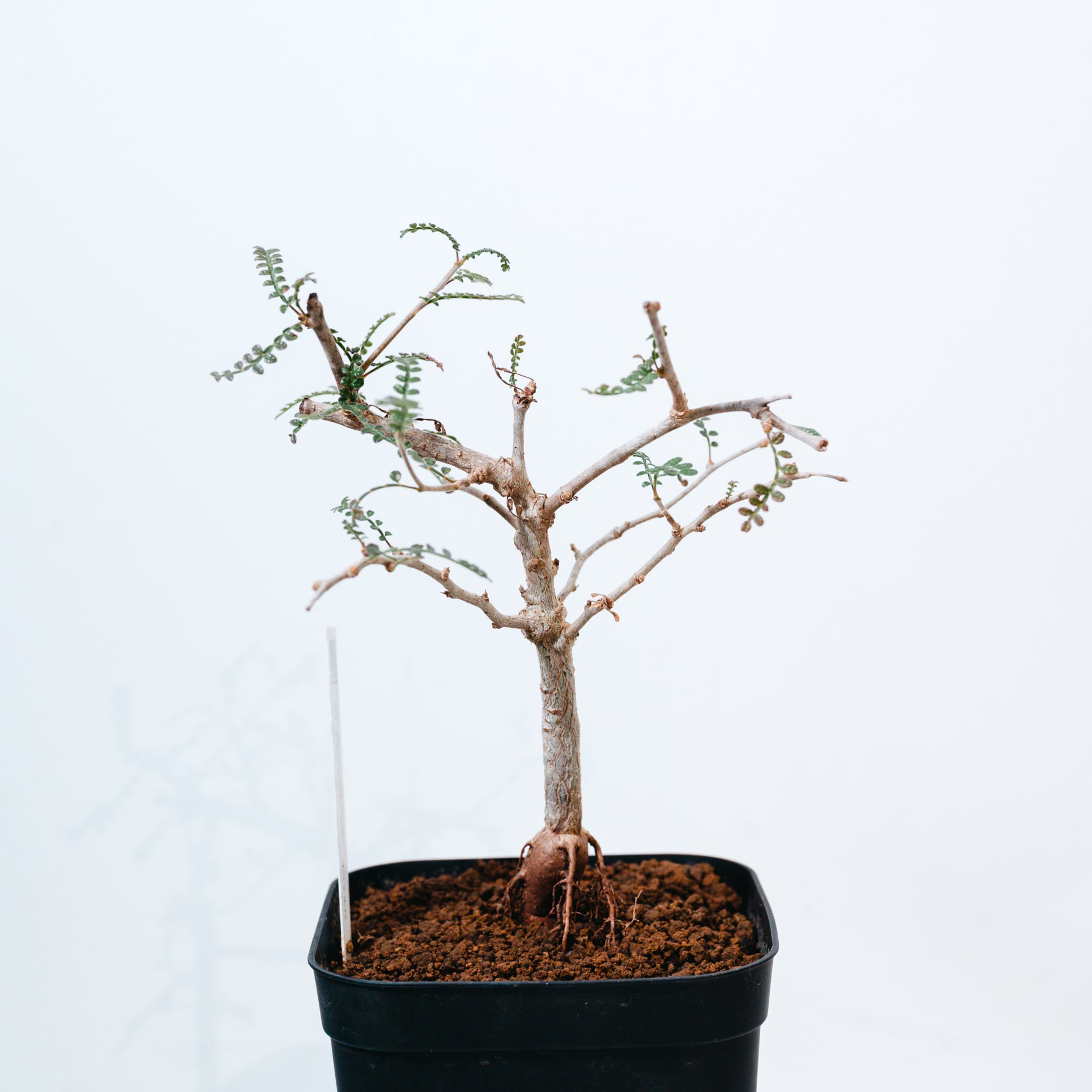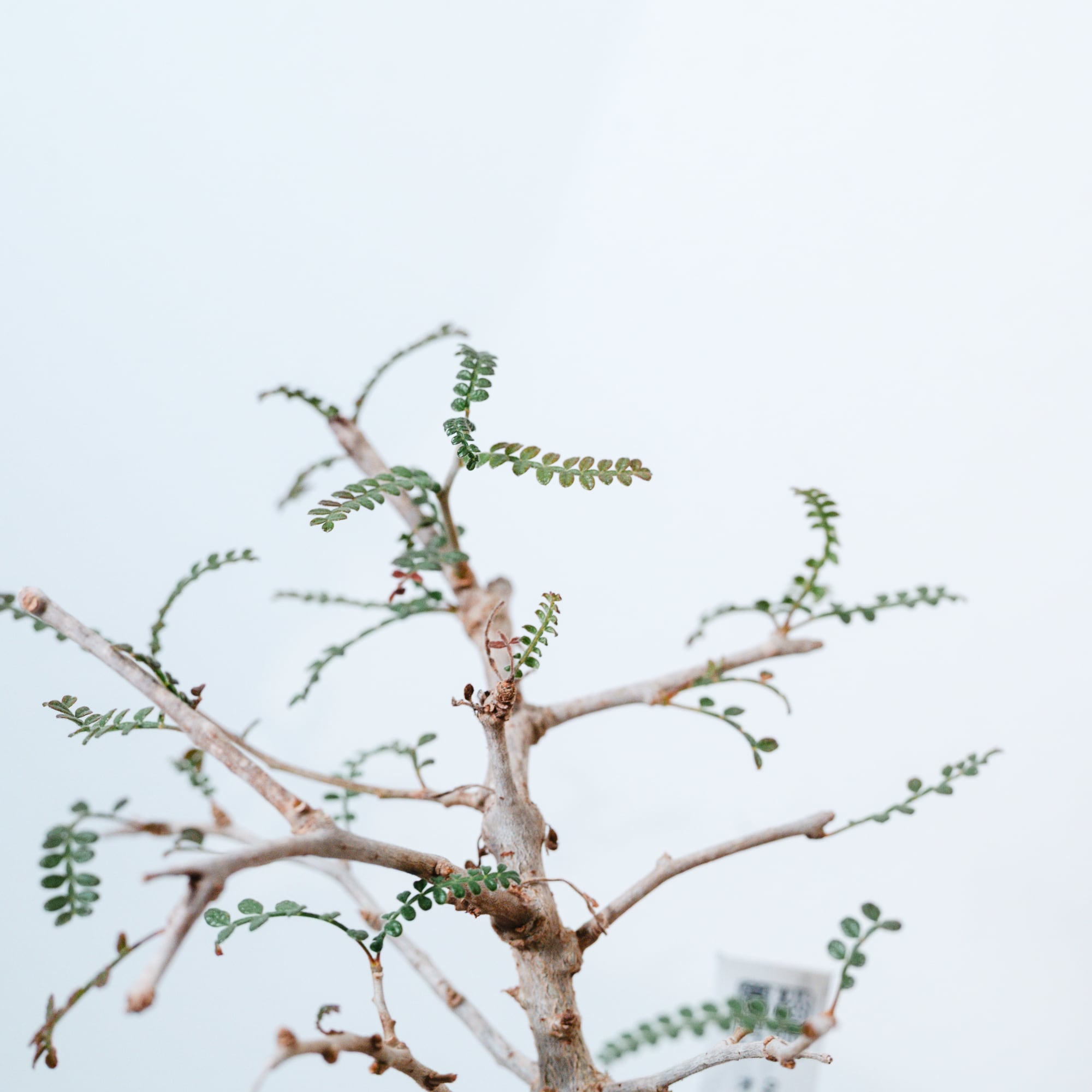 最大の特徴は、小さな羽状複葉の表面に繊細な「うぶ毛」が生える点で、光に透けると柔らかく幻想的な表情を見せてくれます。成長と共に幹がゴツゴツとした質感に変化し、盆栽のような風格ある佇まいへと育つ、非常にコレクション性の高い一株です。