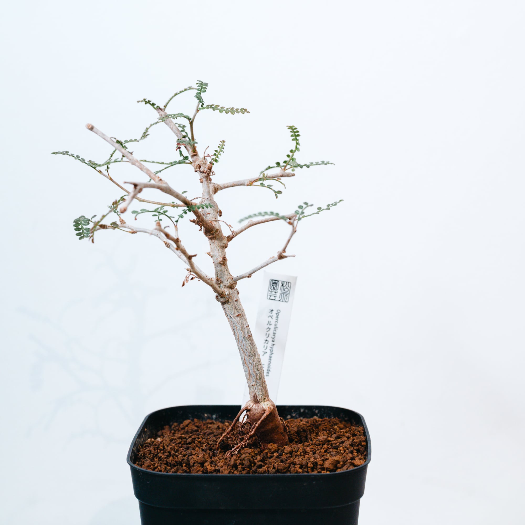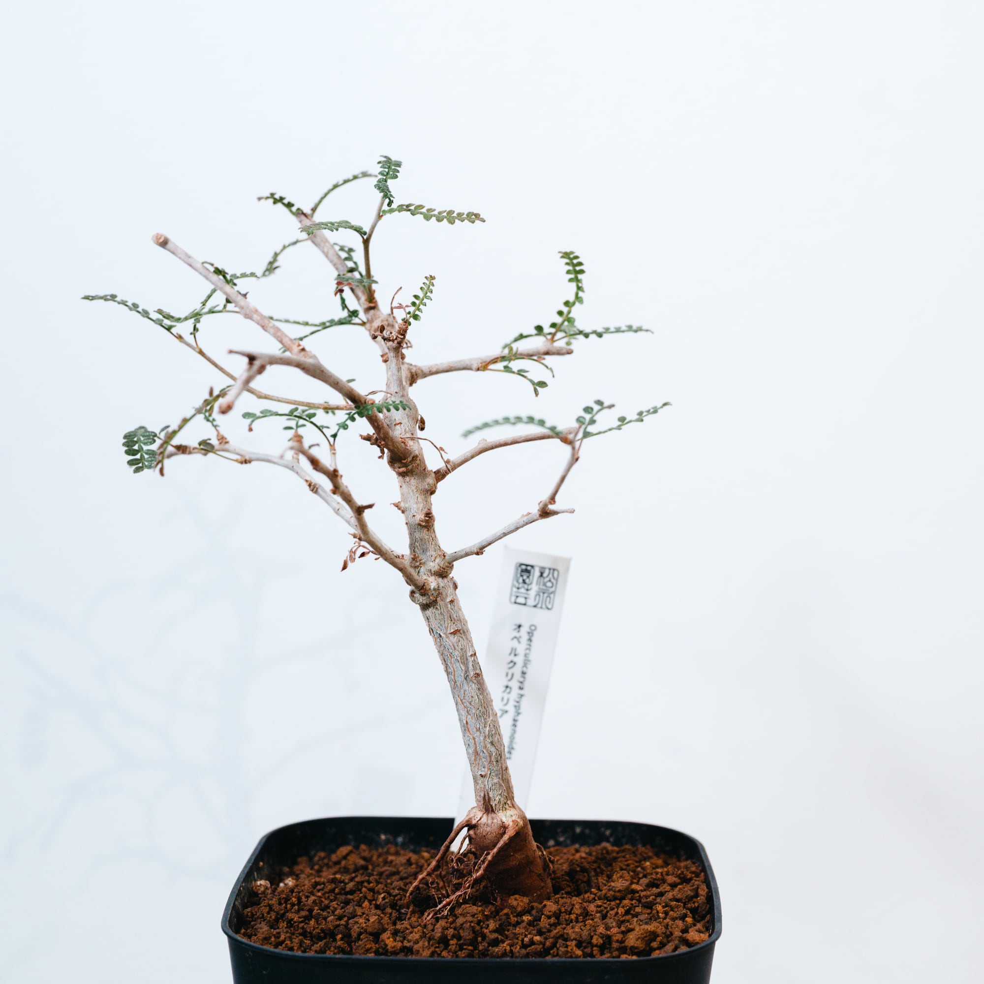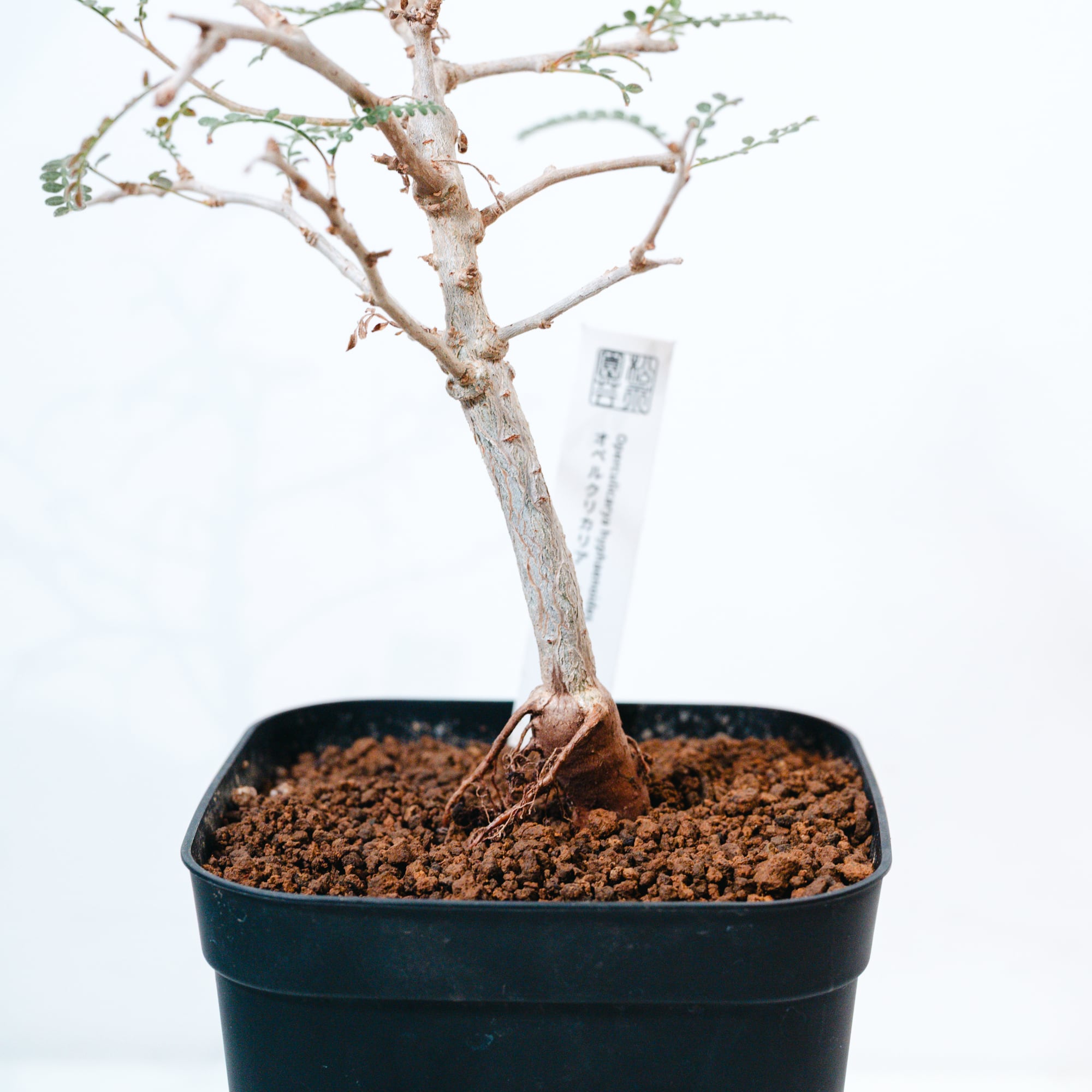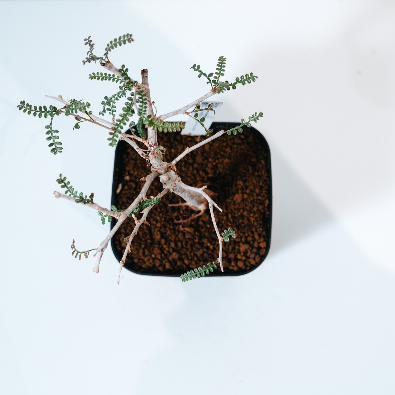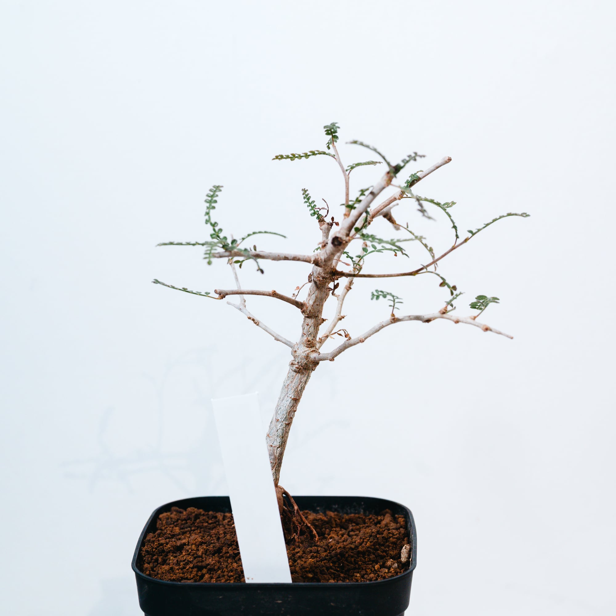 最大の特徴は、小さな羽状複葉の表面に繊細な「うぶ毛」が生える点で、光に透けると柔らかく幻想的な表情を見せてくれます。成長と共に幹がゴツゴツとした質感に変化し、盆栽のような風格ある佇まいへと育つ、非常にコレクション性の高い一株です。