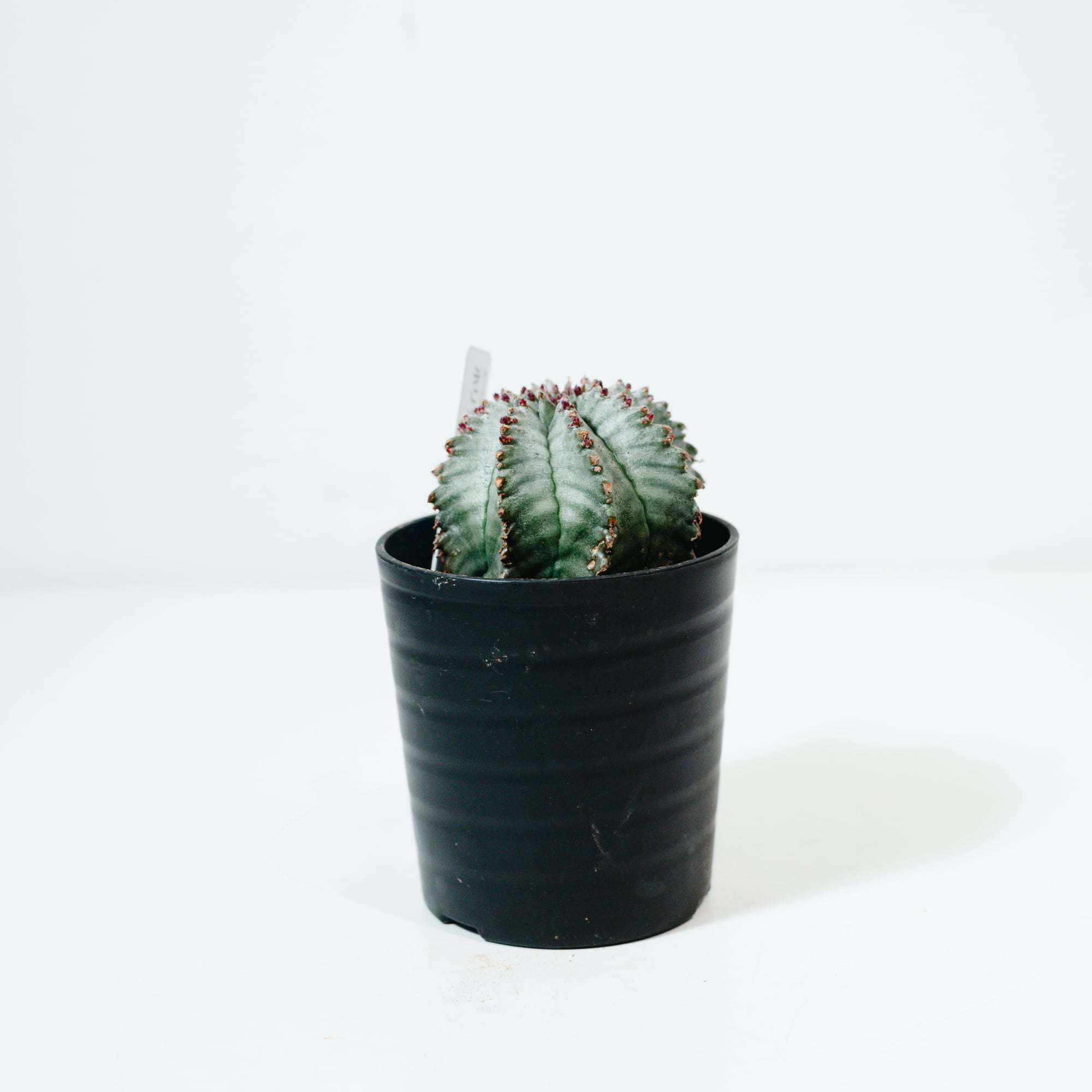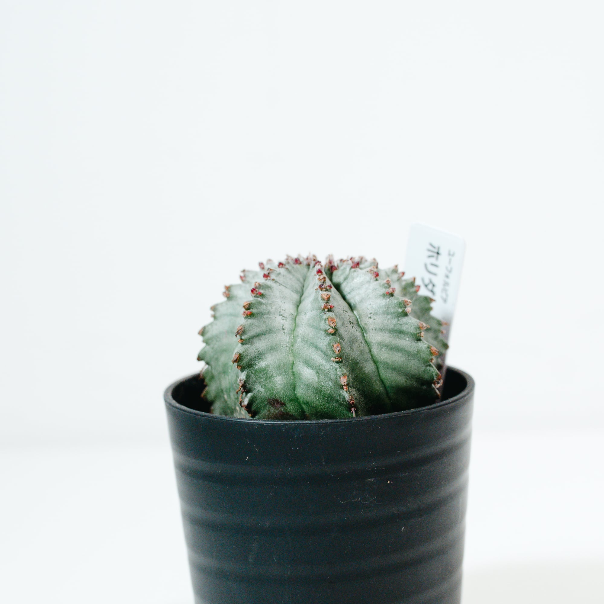 ユーフォルビア・ホリダは、南アフリカ原産の多肉植物で、その名の通り「恐ろしい(Horrida)」という意味を持つ鋭い棘のような「花柄(かへい)」が特徴です。サボテンに似た外見をしていますが、トウダイグサ科の植物であり、白みがかった青緑色の肌(白粉)と、稜(りゅう)が深く刻まれた彫刻的なフォルムが非常に美しい品種です。成長に伴って木質化していく様子や、群生していく姿には独特の風格があり、塊根植物(コーデックス)ファンからも根強い人気を誇ります。