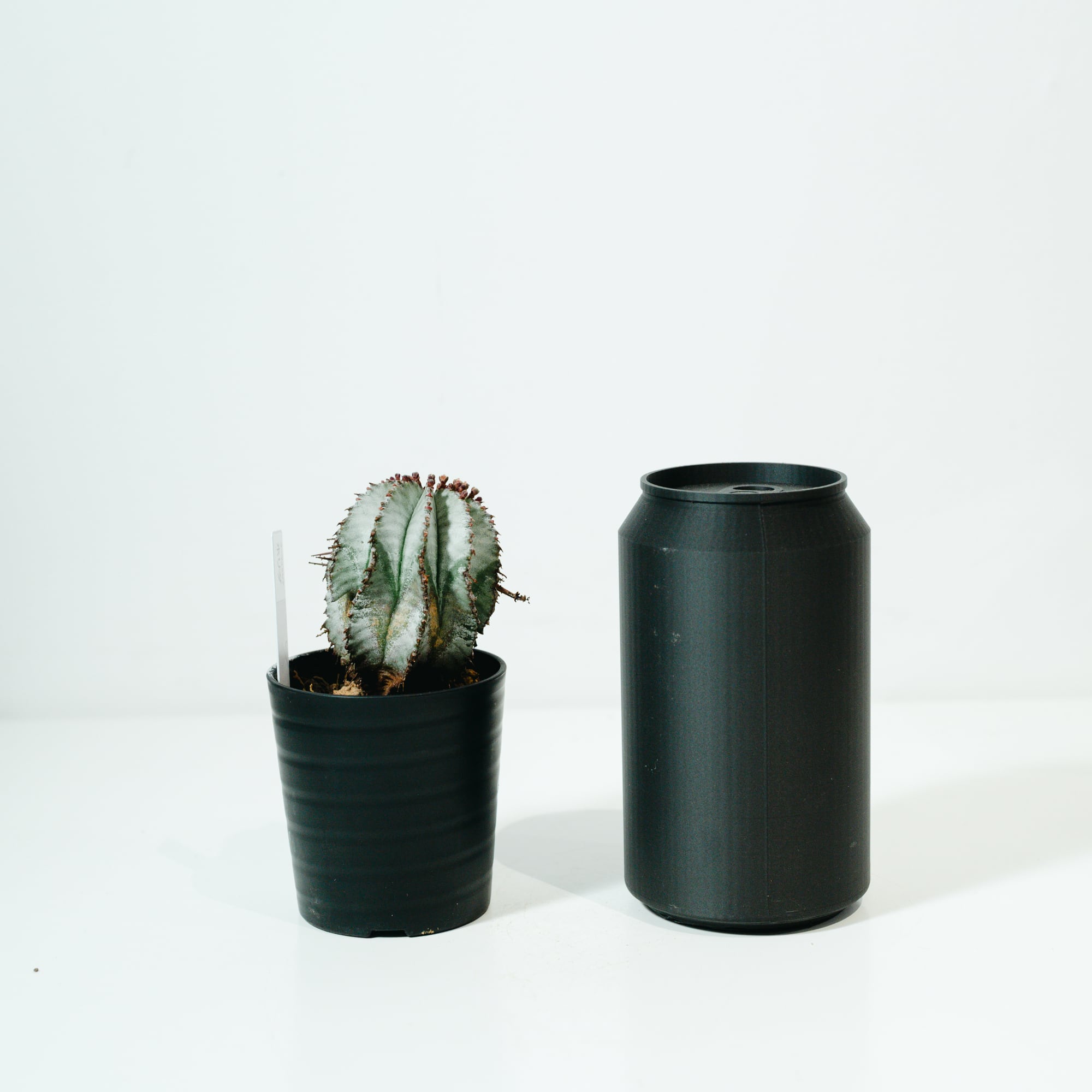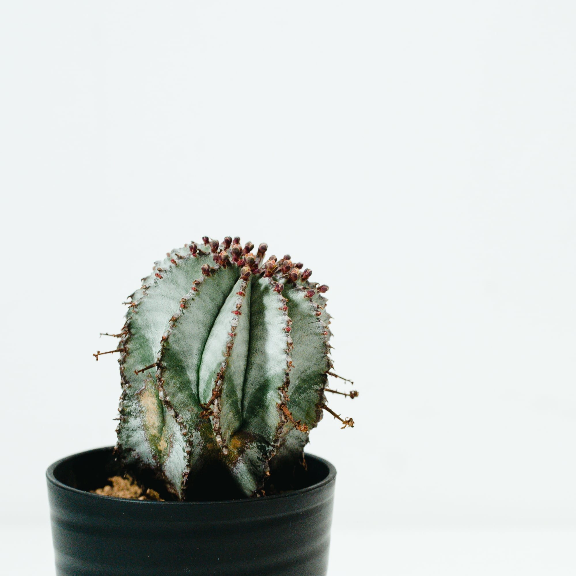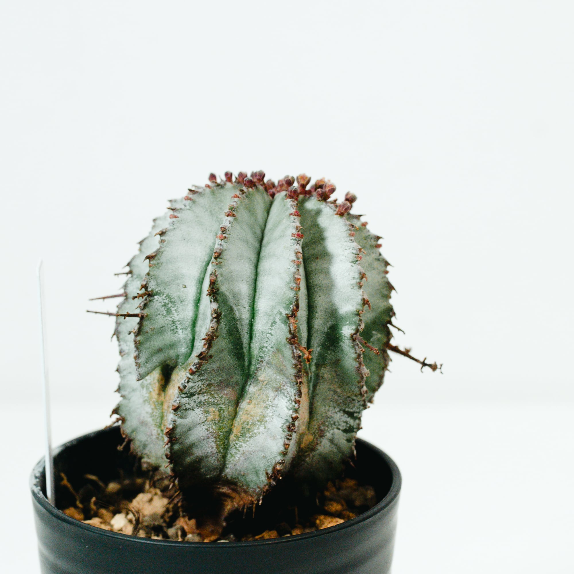 ユーフォルビア・ホリダは、南アフリカ原産の多肉植物で、その名の通り「恐ろしい(Horrida)」という意味を持つ鋭い棘のような「花柄(かへい)」が特徴です。サボテンに似た外見をしていますが、トウダイグサ科の植物であり、白みがかった青緑色の肌(白粉)と、稜(りゅう)が深く刻まれた彫刻的なフォルムが非常に美しい品種です。成長に伴って木質化していく様子や、群生していく姿には独特の風格があり、塊根植物(コーデックス)ファンからも根強い人気を誇ります。